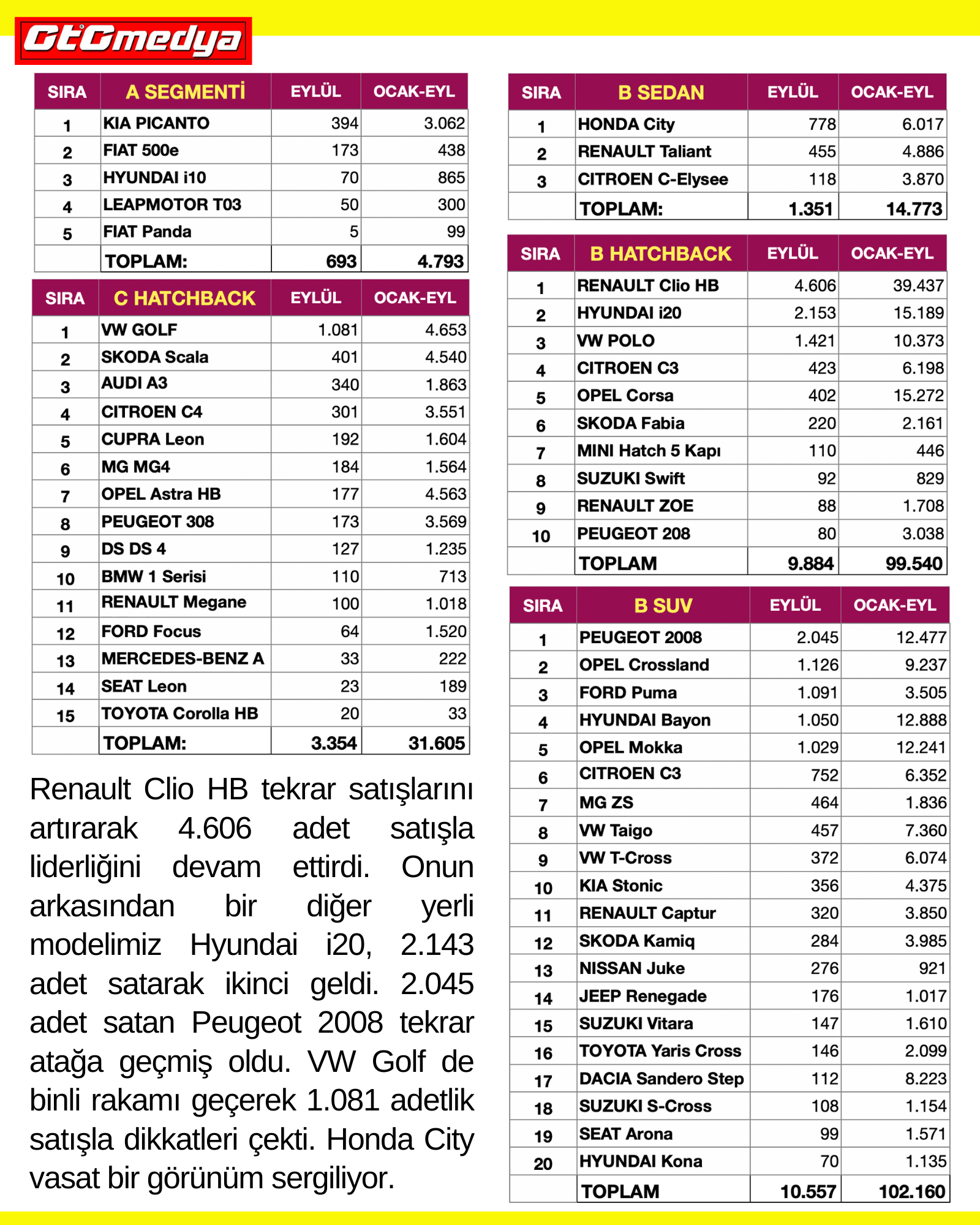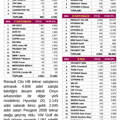 Renault Clio HB tekrar satışlarını artırarak 4.606 adet satışla liderliğini devam ettirdi. Onun arkasından bir diğer yerli modelimiz Hyundai i20, 2.143 adet satarak ikinci geldi. 2.045 adet satan Peugeot 2008 tekrar atağa geçmiş oldu. VW Golf de binli rakamı geçerek 1.081 adetlik satışla dikkatleri çekti. Honda City vasat bir görünüm sergiliyor.