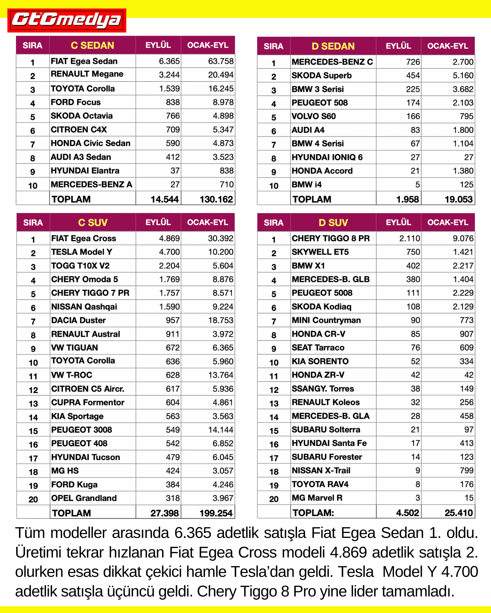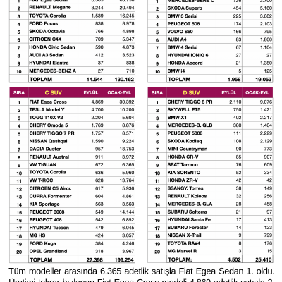 Tüm modeller arasında 6.365 adetlik satışla Fiat Egea Sedan 1. oldu. Üretimi tekrar hızlanan Fiat Egea Cross modeli 4.869 adetlik satışla 2. olurken esas dikkat çekici hamle Tesla’dan geldi. Tesla Model Y 4.700 adetlik satışla üçüncü geldi. Chery Tiggo 8 Pro yine lider tamamladı.