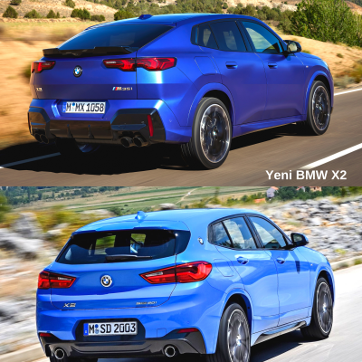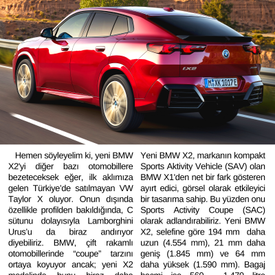 Hemen söyleyelim ki, yeni BMW X2'yi diğer bazı otomobillere bezeteceksek eğer, ilk aklımıza gelen Türkiye’de satılmayan VW Taylor X oluyor. Onun dışında özellikle profilden bakıldığında, C sütunu dolayısıyla Lamborghini Urus’u da biraz andırıyor diyebiliriz. BMW, çift rakamlı otomobillerinde “coupe” tarzını ortaya koyuyor ancak; yeni X2 modelinde bunu biraz daha abartmış sanki! Önde böbreklerde de biraz büyüme olmuş. Yeni BMW X2, selefine göre 194 mm daha uzun (4.554 mm), 21 mm daha geniş (1.845 mm) ve 64 mm daha yüksek (1.590 mm). Bagaj hacmi ise 560 - 1.470 litre arasında değişiyor. İç mekanı sade ama şık tasarlanmış.