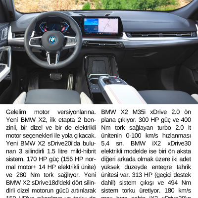 Gelelim motor versiyonlarına. Yeni BMW X2, ilk etapta 2 ben-zinli, bir dizel ve bir de elektrikli motor seçenekleri ile yola çıkacak. Yeni BMW X2 sDrive20i’da bulunan 3 silindirli 1.5 litre mild-hibrit sistem, 170 HP güç (156 HP normal motor+ 14 HP elektrikli ünite) ve 280 Nm tork sağlıyor. Yeni BMW X2 sDrive18d'deki dört silin-dirli dizel motorun gücü artırılarak 150 HP’ye çıkarılmış ve torku da 360 Nm olmuş. Daha fazla performans isteyenler için ise Yeni BMW X2 M35i xDrive 2.0 ön plana çıkıyor. 300 HP güç ve 400 Nm tork sağlayan turbo 2.0 lt ünitenin 0-100 km/s hızlanması 5,4 sn. BMW iX2 xDrive30 elektrikli modelde ise biri ön aksta diğeri arkada olmak üzere iki adet yüksek düzeyde entegre tahrik ünitesi var. 313 HP (geçici destek dahil) sistem çıkışı ve 494 Nm sistem torku üretiyor. 180 km/s max hıza sahip iX2 xDrive30'ın 0-100 km/s hızlanması 5,6 sn ve 449 km’ye kadar menzili var.