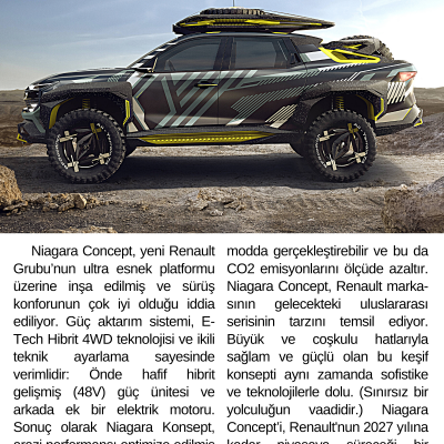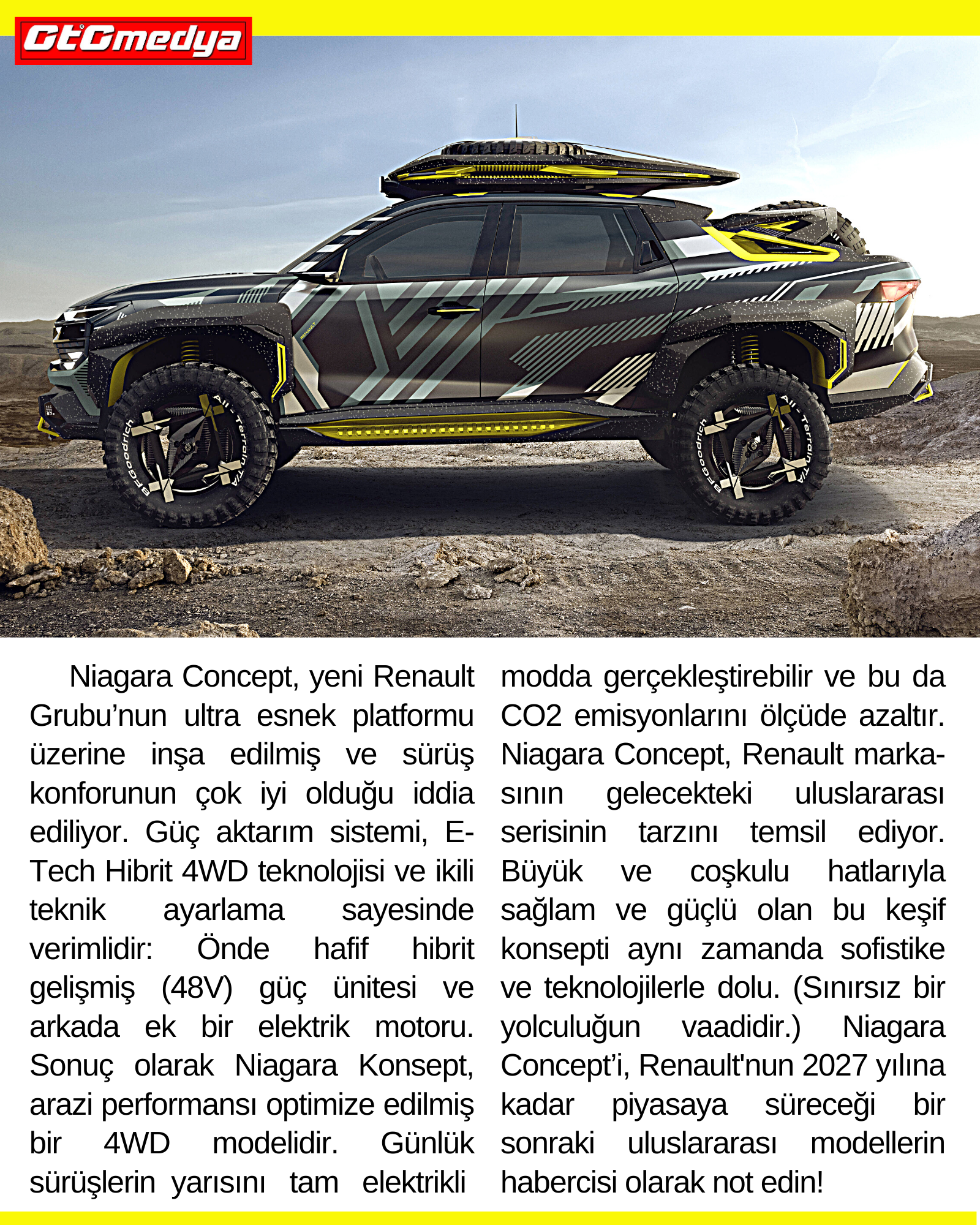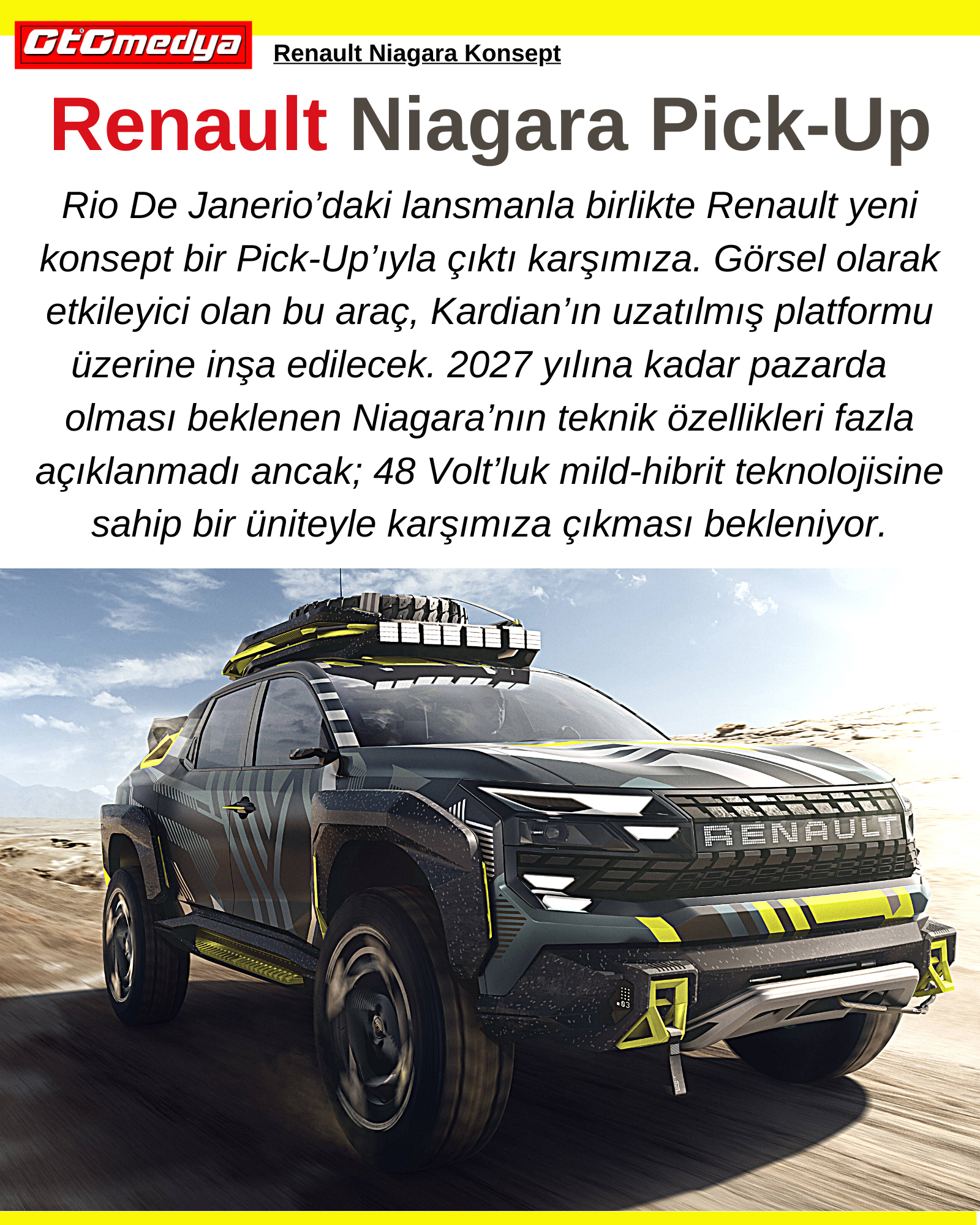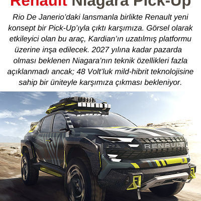 Rio De Janerio’daki lansmanla birlikte Renault yeni konsept bir Pick-Up’ıyla çıktı karşımıza. Görsel olarak etkileyici olan bu araç, Kardian’ın uzatılmış platformu üzerine inşa edilecek. 2027 yılına kadar pazarda olması beklenen Niagara’nın teknik özellikleri fazla açıklanmadı ancak; 48 Volt’luk mild-hibrit teknolojisine sahip bir üniteyle karşımıza çıkması bekleniyor.