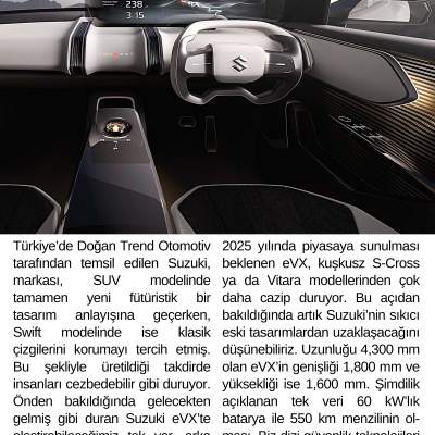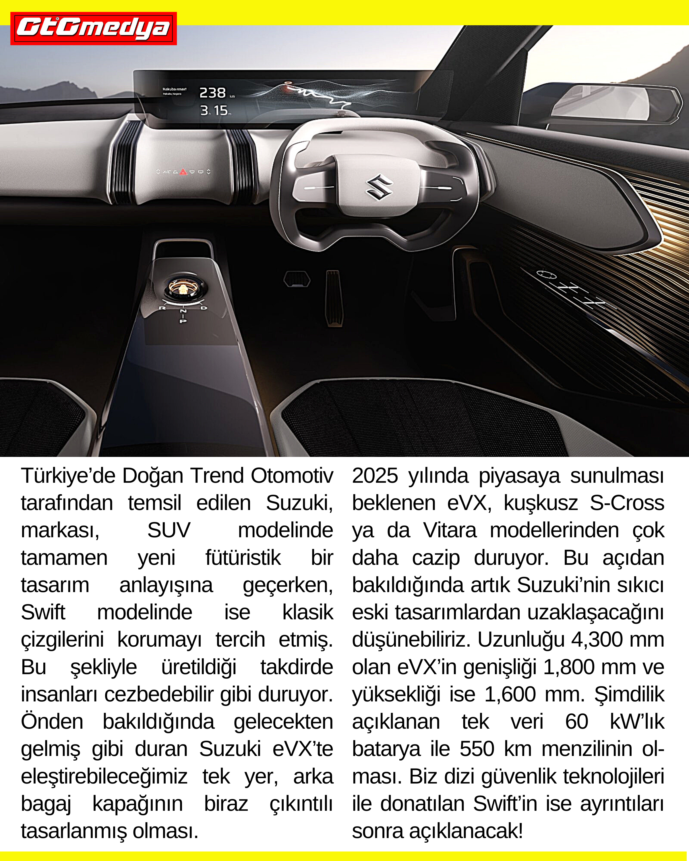 2025 yılında piyasaya sunulması beklenen eVX, kuşkusz S-Cross ya da Vitara modellerinden çok daha cazip duruyor. Bu açıdan bakıldığında artık Suzuki’nin sıkıcı eski tasarımlardan uzaklaşacağını düşünebiliriz. Uzunluğu 4,300 mm olan eVX’in genişliği 1,800 mm ve yüksekliği ise 1,600 mm. Şimdilik açıklanan tek veri 60 kW’lık batarya ile 550 km menzilinin ol-ması. Biz dizi güvenlik teknolojileri ile donatılan Swift’in ise ayrıntıları sonra açıklanacak!