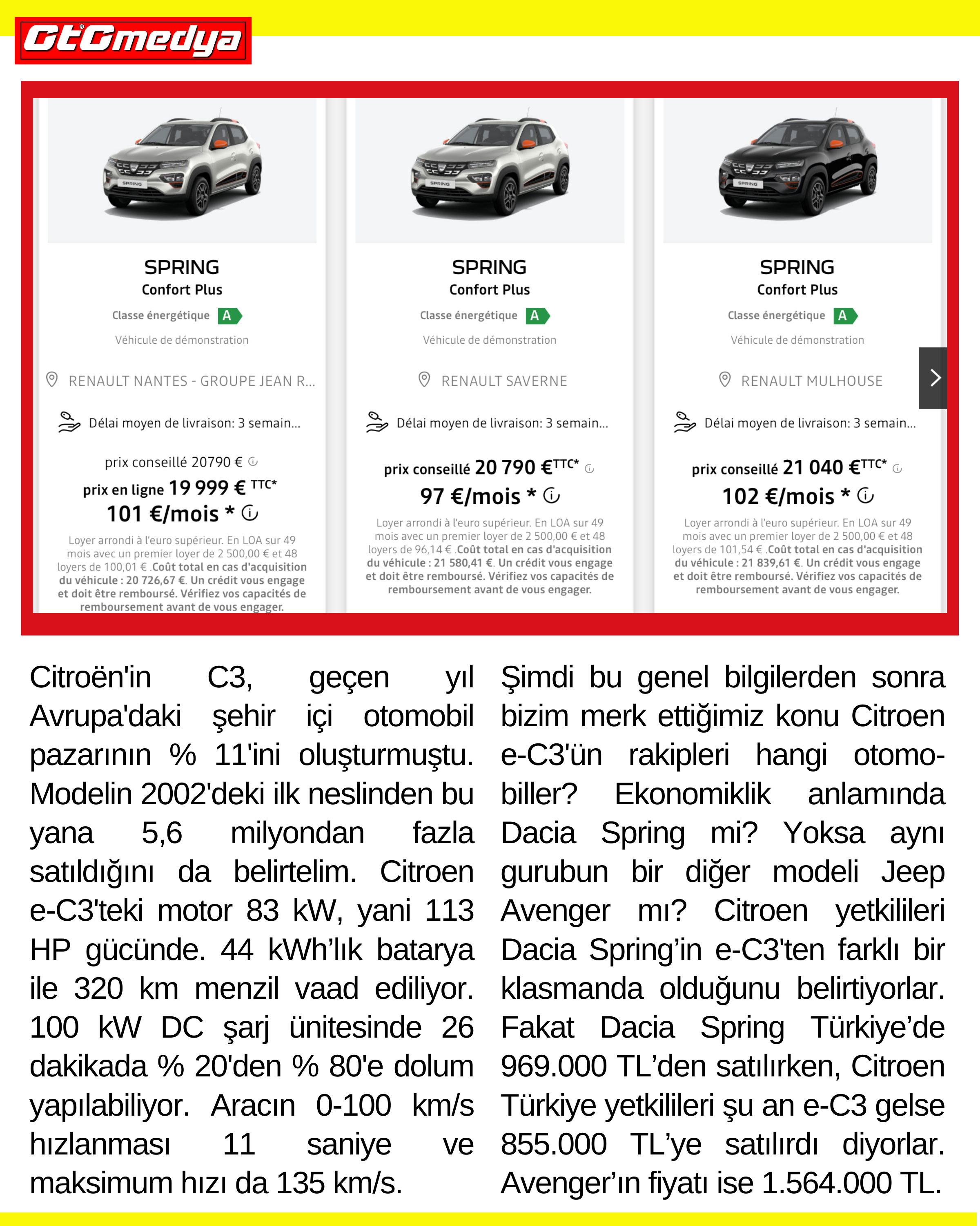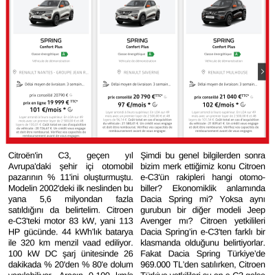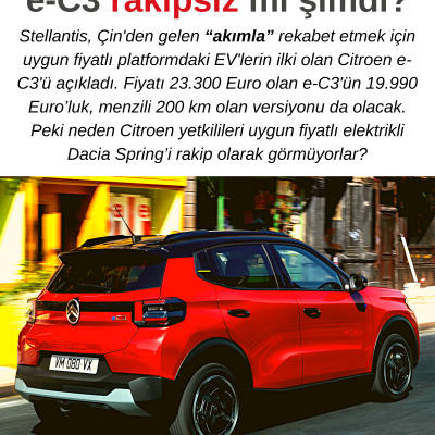 Bu durumda soracağımız soru şu: Türkiye’de e-C3'ten daha pahalı satılan Dacia Spring nasıl olur da rakibi olmaz? Dacia Spring’in Fransa satış fiyatlarına baktığımız zaman ortalama 20.000 Euro civarında olduğunu görüyoruz. Dacia Spring, e-C3'ten 30 cm civarı daha kısa, motor gücü ise 48 HP daha az ve menzili de 220 km. Yani, bu özelliklere baktığımız zaman e-C3 modelinin çok daha avantajlı olduğu ortaya çıkıyor, bu yüzden rakibi olmayabilir!