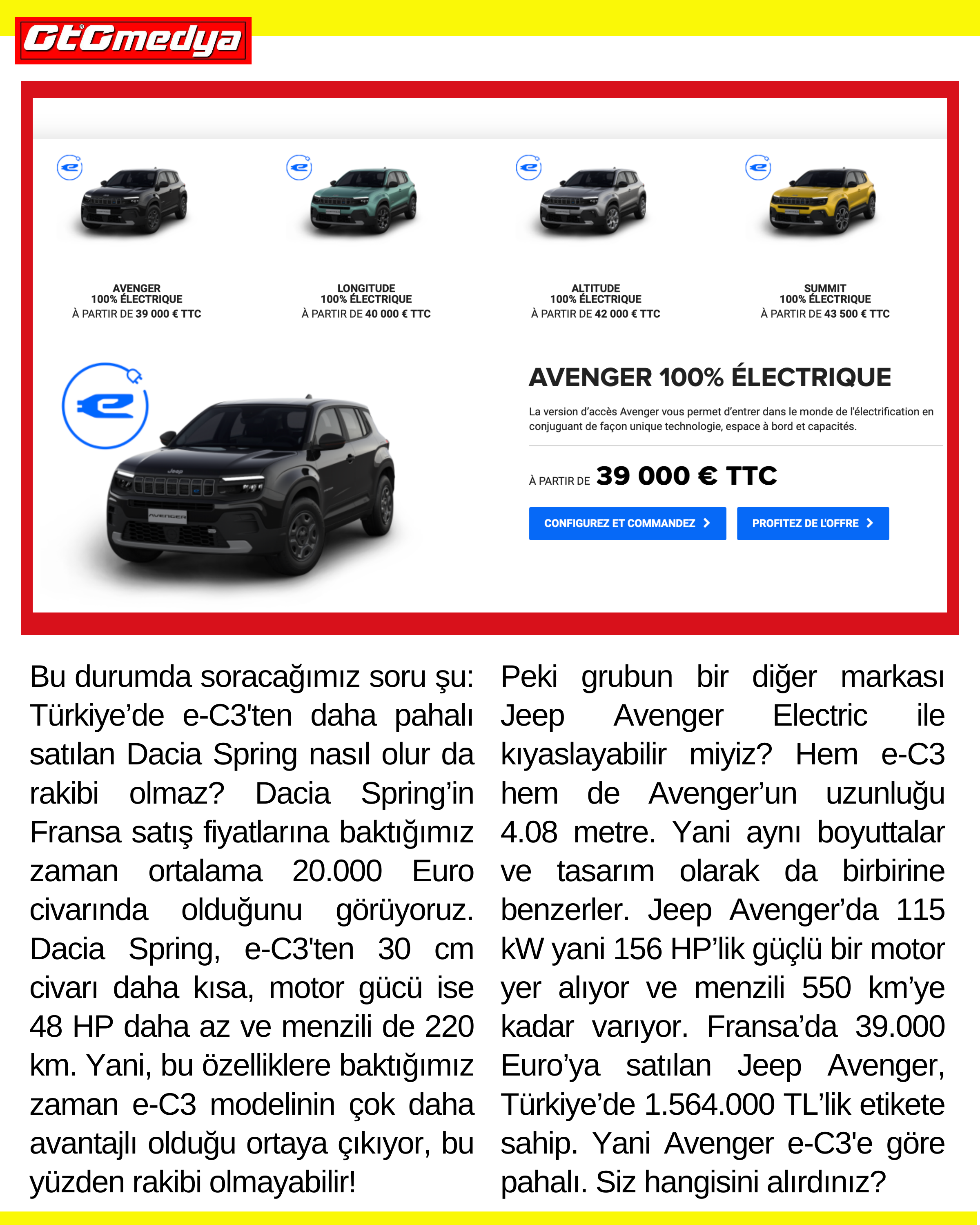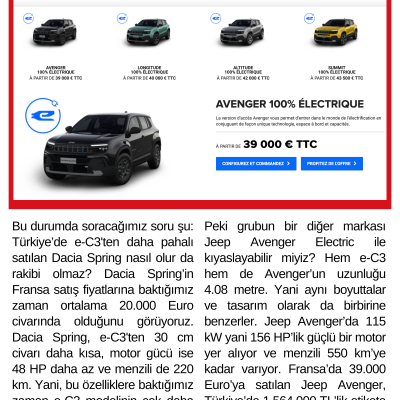 Peki grubun bir diğer markası Jeep Avenger Electric ile kıyaslayabilir miyiz? Hem e-C3 hem de Avenger’un uzunluğu 4.08 metre. Yani aynı boyuttalar ve tasarım olarak da birbirine benzerler. Jeep Avenger’da 115 kW yani 156 HP’lik güçlü bir motor yer alıyor ve menzili 550 km’ye kadar varıyor. Fransa’da 39.000 Euro’ya satılan Jeep Avenger, Türkiye’de 1.564.000 TL’lik etikete sahip. Yani Avenger e-C3'e göre pahalı. Siz olsanız hangisini alırdınız?