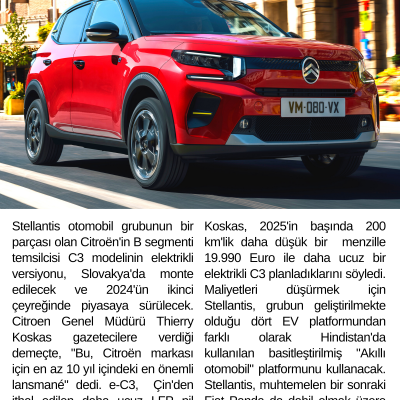 Stellantis otomobil grubunun bir parçası olan Citroën'in B segmenti temsilcisi C3 modelinin elektrikli versiyonu, Slovakya'da monte edilecek ve 2024'ün ikinci çeyreğinde piyasaya sürülecek. Citroen Genel Müdürü Thierry Koskas gazetecilere verdiği demeçte, "Bu, Citroën markası için en az 10 yıl içindeki en önemli lansmanı" dedi. e-C3,  Çin'den ithal edilen daha ucuz LFP pil teknolojisini kullanan 320 km (199 mil) bir menzile sahip.