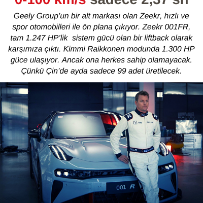 Geely^nin markalarından biri olan Zeekr, daha çok küresel pazar için düşünülmüş bir marka. Almanya, Hollanda, İsveç, Kazakistan, İsrail, Suudi Arabistan, BAE, Katar, Bahreyn ve Hong Kong gibi ülkelerde şu anda faaliyet gösteriyor. Zeekr yetkilileri şimdilik “001 FR” modelinin dünyanın en güçlü seri üretim elektrikli otomobili olduğunu iddia ediyorlar. Belki 4 kapılı olarak dedikleri gibi olabilir ve Lotus Evija ve 1.914 HP’lik Rimac Nevera’nın gerisinde.
