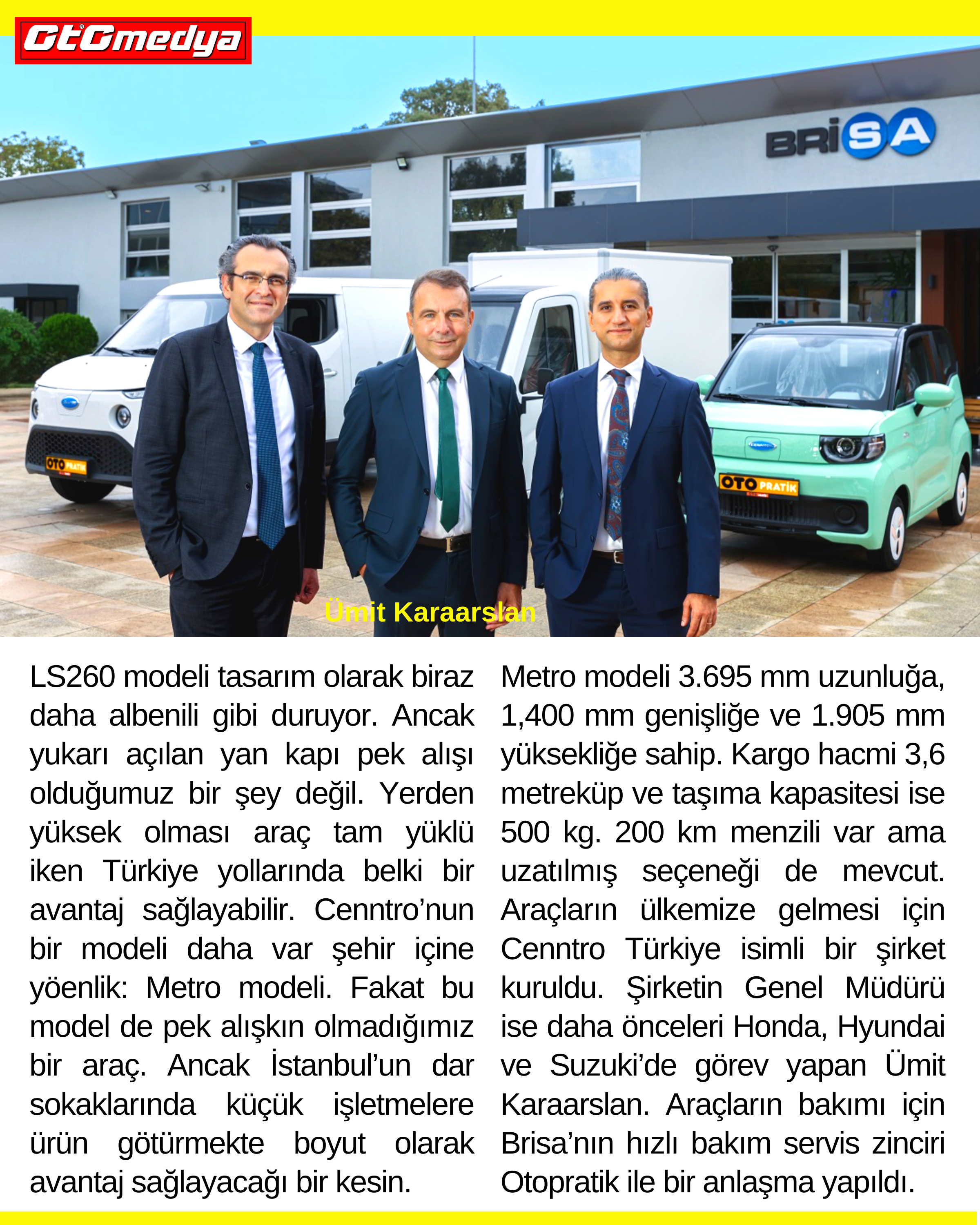 Metro modeli 3.695 mm uzunluğa, 1,400 mm genişliğe ve 1.905 mm yüksekliğe sahip. Kargo hacmi 3,6 metreküp ve taşıma kapasitesi ise 500 kg. 200 km menzili var ama uzatılmış seçeneği de mevcut. Araçların ülkemize gelmesi için Cenntro Türkiye isimli bir şirket kuruldu. Şirketin Genel Müdürü ise daha önceleri Honda, Hyundai, Suzuki ve Toyota’da görev yapan Ümit Karaarslan. Araçların bakımı için Brisa’nın hızlı bakım servis zinciri Otopratik ile bir anlaşma yapıldı.