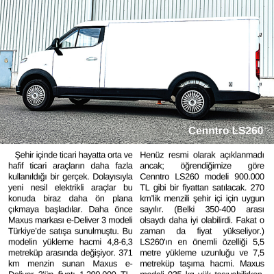 Henüz resmi olarak açıklanmadı ancak; öğrendiğimize göre Cenntro LS260 modeli 900.000 TL gibi bir fiyattan satılacak. 270 km’lik menzili şehir içi için uygun sayılır. (Belki 350-400 arası olsaydı daha iyi olabilirdi. Fakat o zaman da fiyat yükseliyor.) LS260'ın en önemli özelliği 5,5 metre yükleme uzunluğu ve 7,5 metreküp taşıma hacmi. Maxus modeli 935 kg yük taşıyabilirken, Cenntro LS260 ise 1.280 kg’a kadar yükleri taşıyabilir.