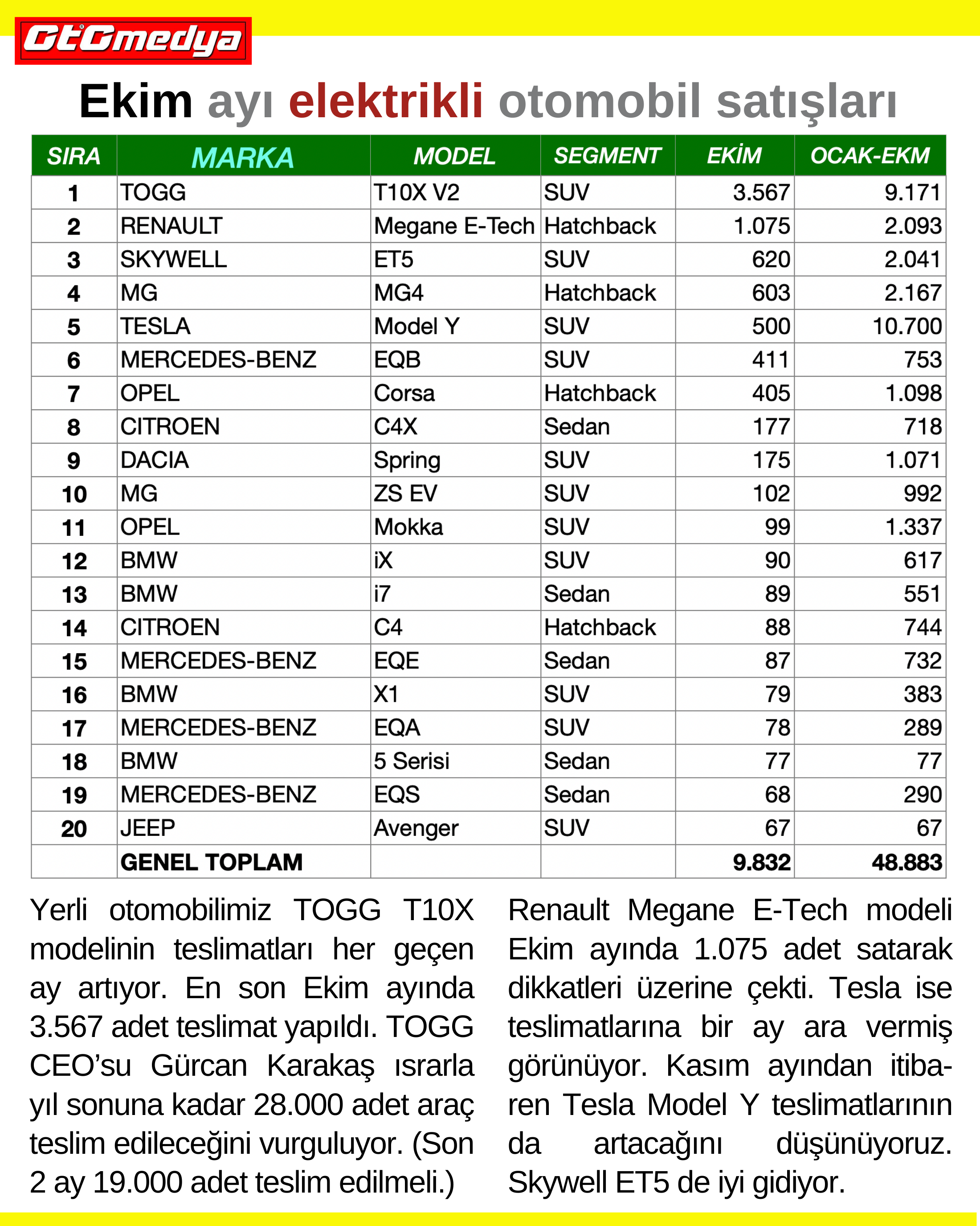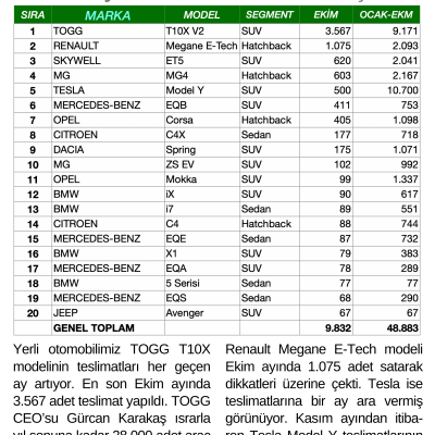 Yerli otomobilimiz TOGG T10X modelinin teslimatları her geçen ay artıyor. En son Ekim ayında 3.567 adet teslimat yapıldı. TOGG CEO’su Gürcan Karakaş ısrarla yıl sonuna kadar 28.000 adet araç teslim edileceğini vurguluyor. (Son 2 ay 19.000 adet teslim edilmeli.) Renault Megane E-Tech modeli Ekim ayında 1.075 adet satarak dikkatleri üzerine çekti. Tesla ise teslimatlarına bir ay ara vermiş görünüyor. Kasım ayından itibaren Tesla Model Y teslimatlarının da artacağını düşünüyoruz. Skywell ET5 de iyi gidiyor.