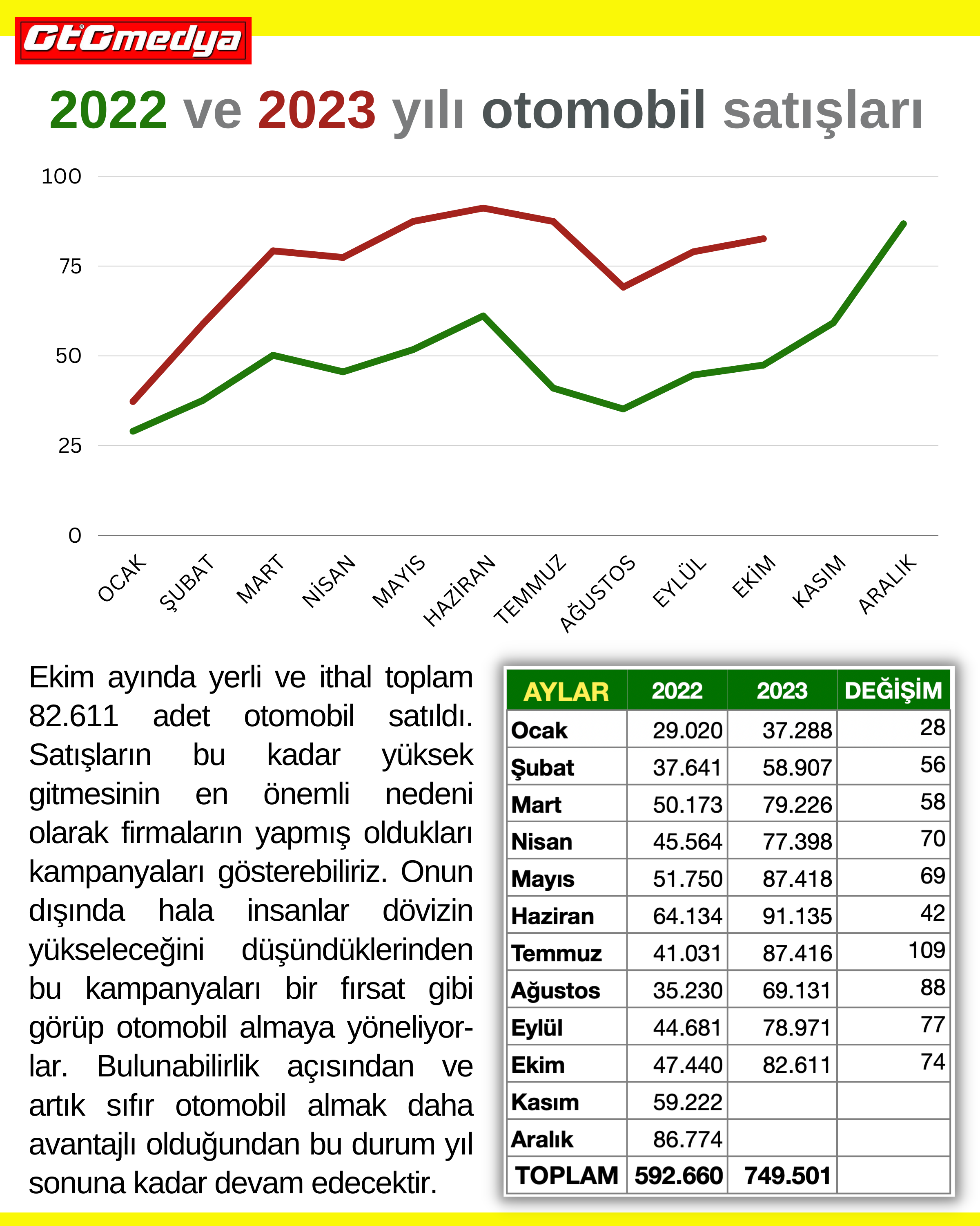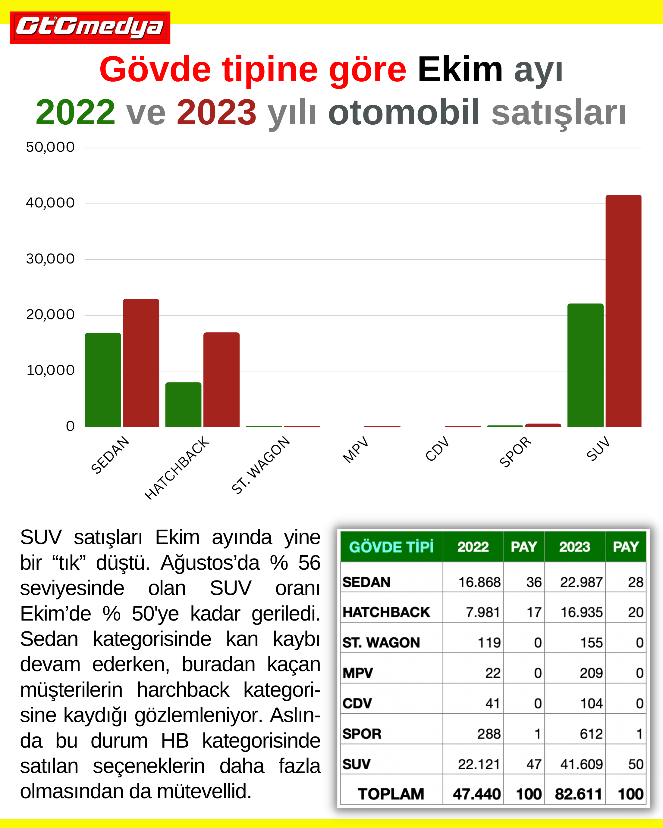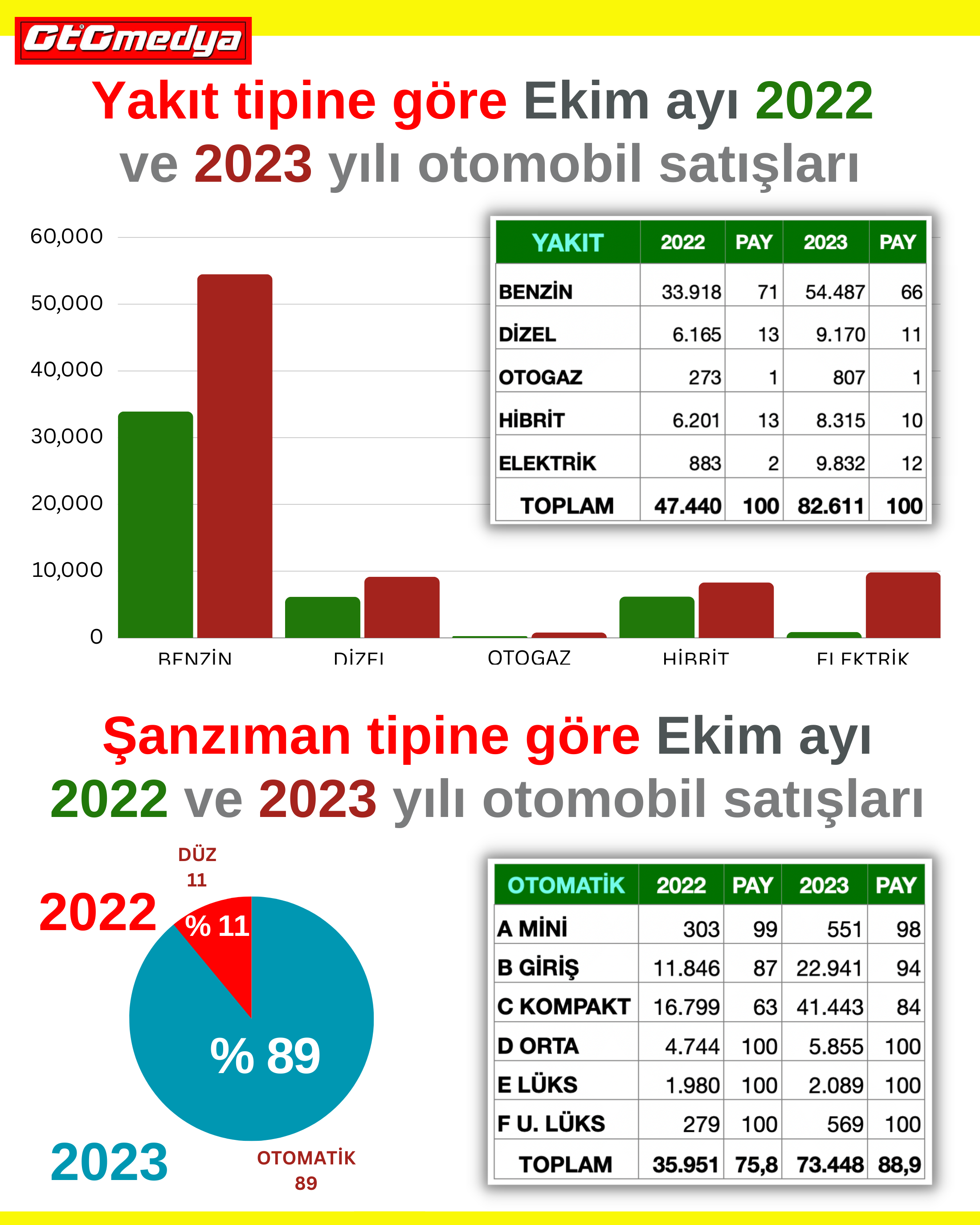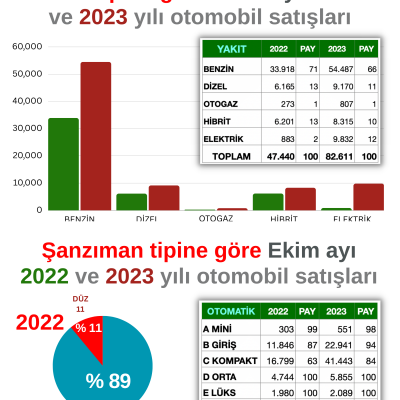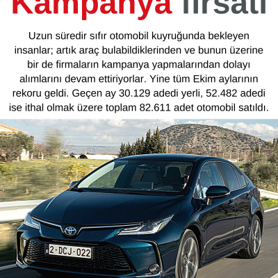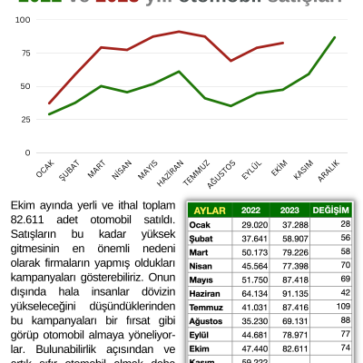 Ekim ayında yerli ve ithal toplam 82.611 adet otomobil satıldı. Satışların bu kadar yüksek gitmesinin en önemli nedeni olarak firmaların yapmış oldukları kampanyaları gösterebiliriz. Onun dışında hala insanlar dövizin yükseleceğini düşündüklerinden bu kampanyaları bir fırsat gibi görüp otomobil almaya yöneliyorlar. Bulunabilirlik açısından ve artık sıfır otomobil almak daha avantajlı olduğundan bu durum yıl sonuna kadar devam edecektir.