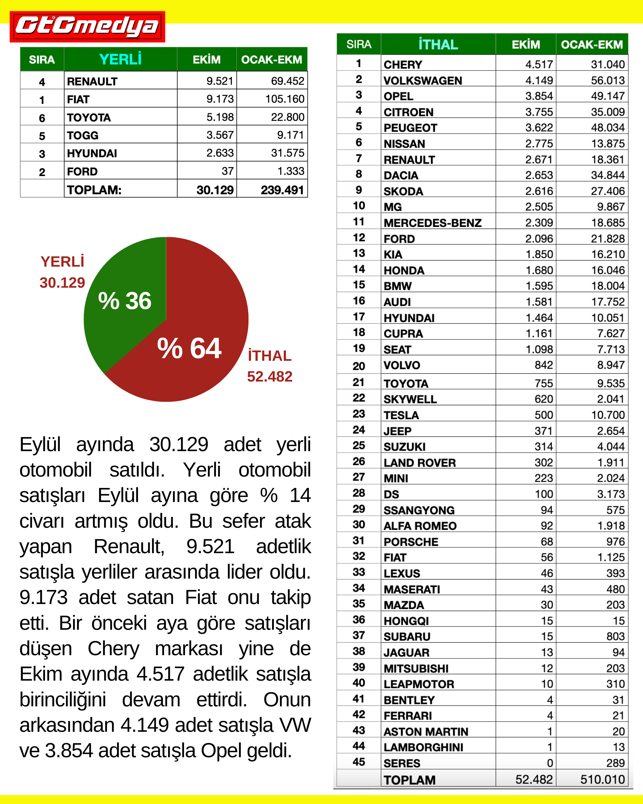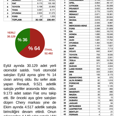 Eylül ayında 30.129 adet yerli otomobil satıldı. Yerli otomobil satışları Eylül ayına göre % 14 civarı artmış oldu. Bu sefer atak yapan Renault, 9.521 adetlik satışla yerliler arasında lider oldu. 9.173 adet satan Fiat onu takip etti. Bir önceki aya göre satışları düşen Chery markası yine de Ekim ayında 4.517 adetlik satışla birinciliğini devam ettirdi. Onun arkasından 4.149 adet satışla VW ve 3.854 adet satışla Opel geldi.