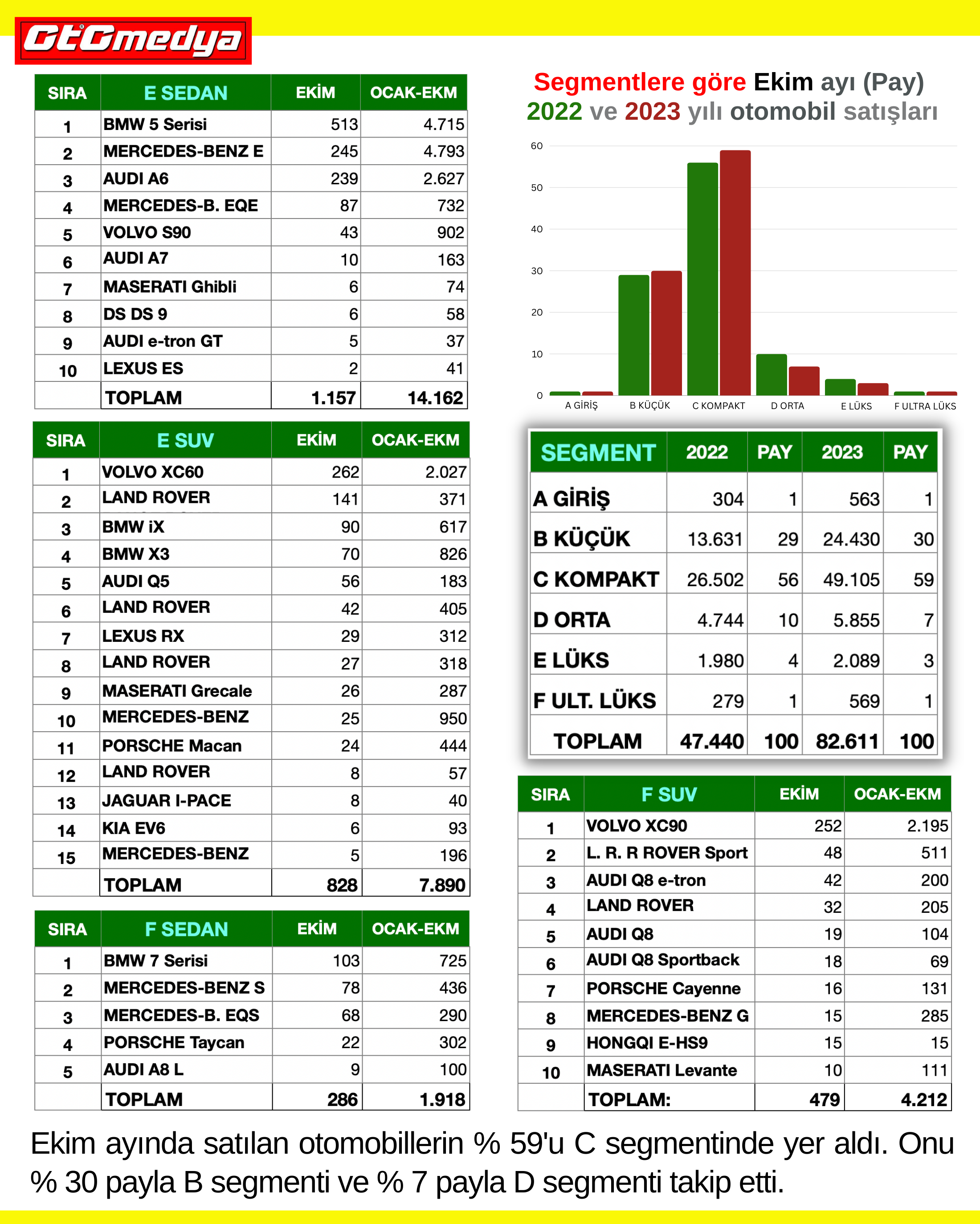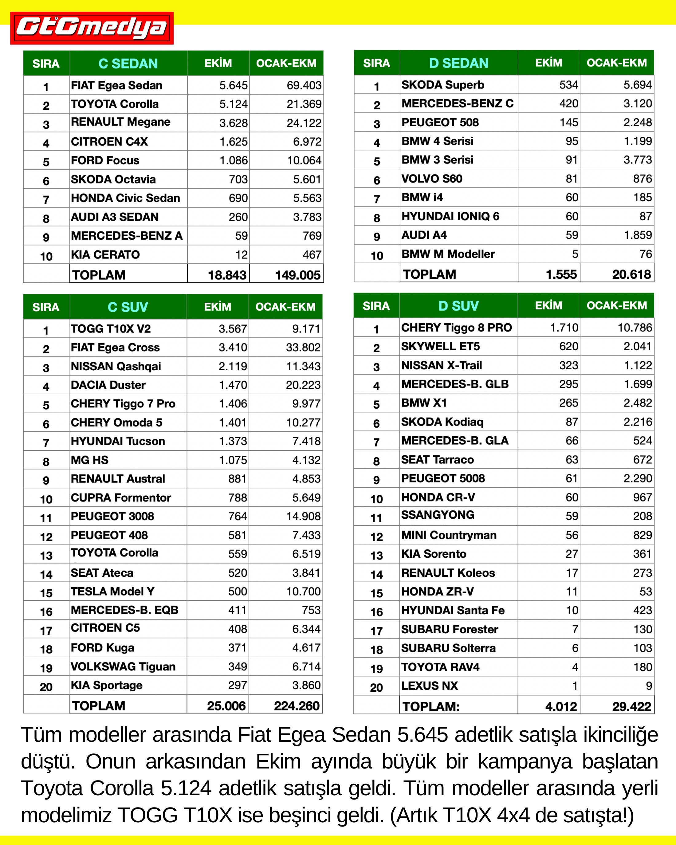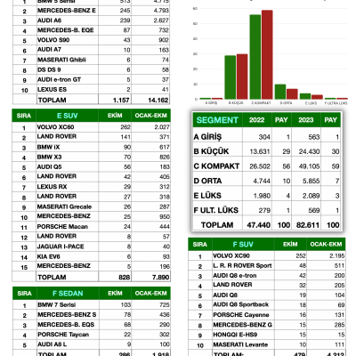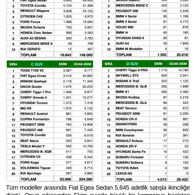 Tüm modeller arasında Fiat Egea Sedan 5.645 adetlik satışla ikinciliğe düştü. Onun arkasından Ekim ayında büyük bir kampanya başlatan Toyota Corolla 5.124 adetlik satışla geldi. Tüm modeller arasında yerli modelimiz TOGG T10X ise beşinci geldi. (Artık T10X 4x4 de satışta!) Ekim ayında satılan otomobillerin % 59'u C segmentinde yer aldı. Onu % 30 payla B segmenti ve % 7 payla D segmenti takip etti.