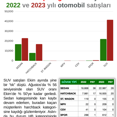 SUV satışları Ekim ayında yine bir “tık” düştü. Ağustos’da % 56 seviyesinde olan SUV oranı Ekim’de % 50'ye kadar geriledi. Sedan kategorisinde kan kaybı devam ederken, buradan kaçan müşterilerin hatchback kategorisine kaydığı gözlemleniyor. Aslında bu durum HB kategorisinde satılan seçeneklerin daha fazla olmasından da mütevellid diyebiliriz.