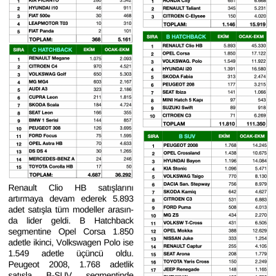 Renault Clio HB satışlarını artırmaya devam ederek 5.893 adet satışla tüm modeller arasında lider geldi. B Hatchback segmentine Opel Corsa 1.850 adetle ikinci, Volkswagen Polo ise 1.549 adetle üçüncü oldu. Peugeot 2008, 1.768 adetlik satışla B-SUV segmentinde birinci, Opel Crossland ise 1.438 adetle ikinci oldu.