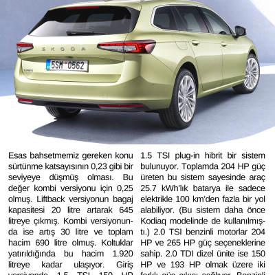 Esas bahsetmemiz gereken konu sürtünme katsayısının 0,23 gibi bir seviyeye düşmüş olması. Bu değer kombi versiyonu için 0,25 olmuş. Liftback versiyonun bagaj kapasitesi 20 litre artarak 645 litreye çıkmış. Kombi versiyonunda ise artış 30 litre ve toplam hacim 690 litre olmuş. Koltuklar yatırıldığında bu hacim 1.920 litreye kadar ulaşıyor. Giriş versiyonda 1.5 TSI 150 HP gücünde mild-hibrit bir motor yer alıyor.