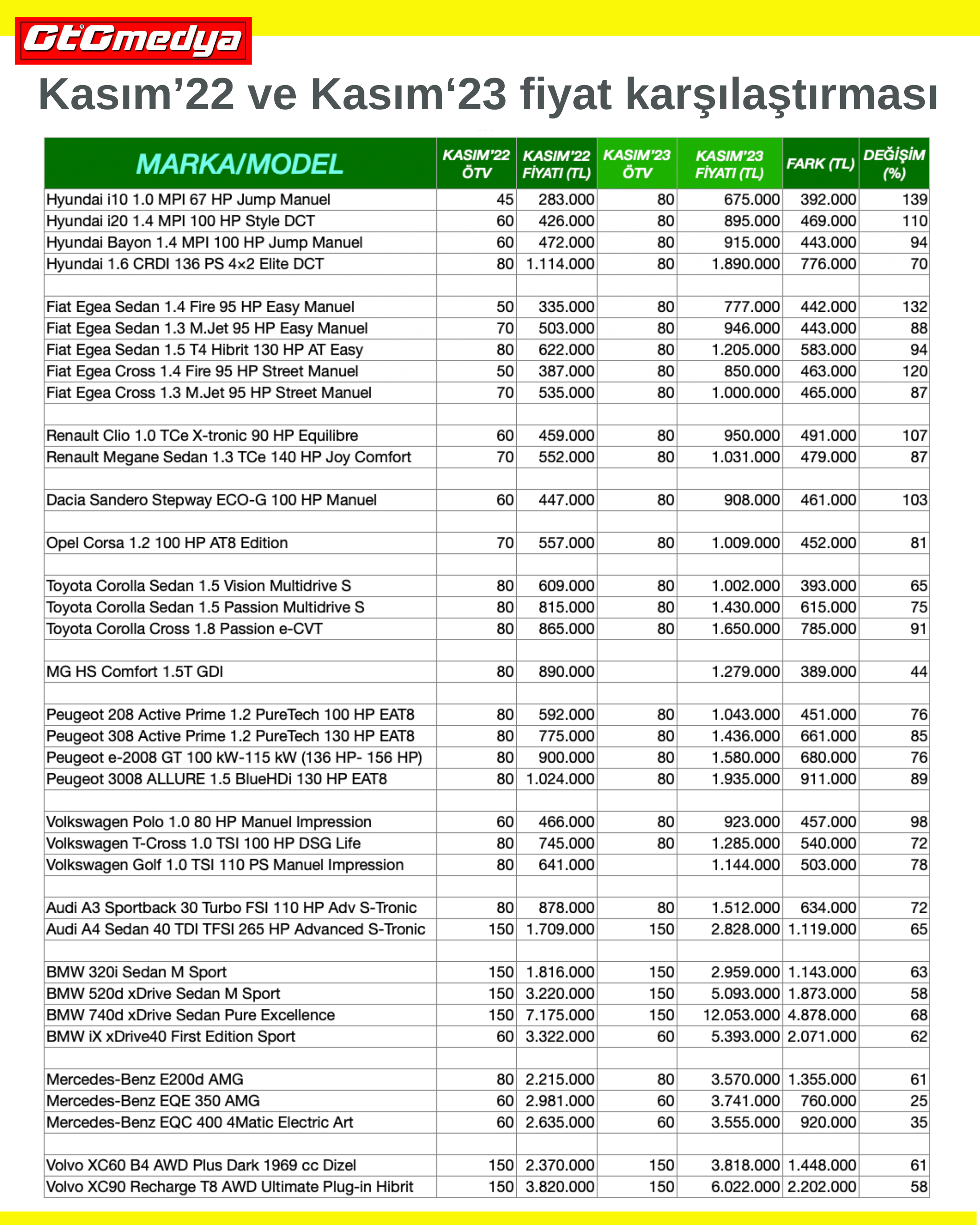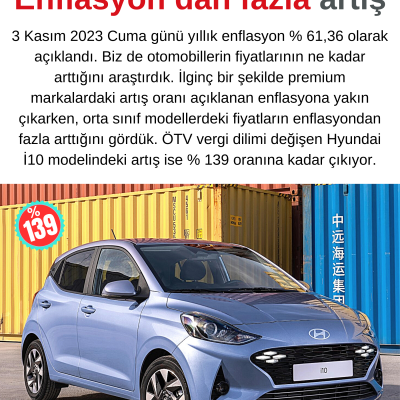 3 Kasım 2023 Cuma günü yıllık enflasyon % 61,36 olarak açıklandı. Biz de otomobillerin fiyatlarının ne kadar arttığını araştırdık. İlginç bir şekilde premium markalardaki artış oranı açıklanan enflasyona yakın çıkarken, orta sınıf modellerdeki fiyatların enflasyondan fazla arttığını gördük. ÖTV vergi dilimi değişen Hyundai i10 modelindeki artış ise % 139 oranına kadar çıkıyor.