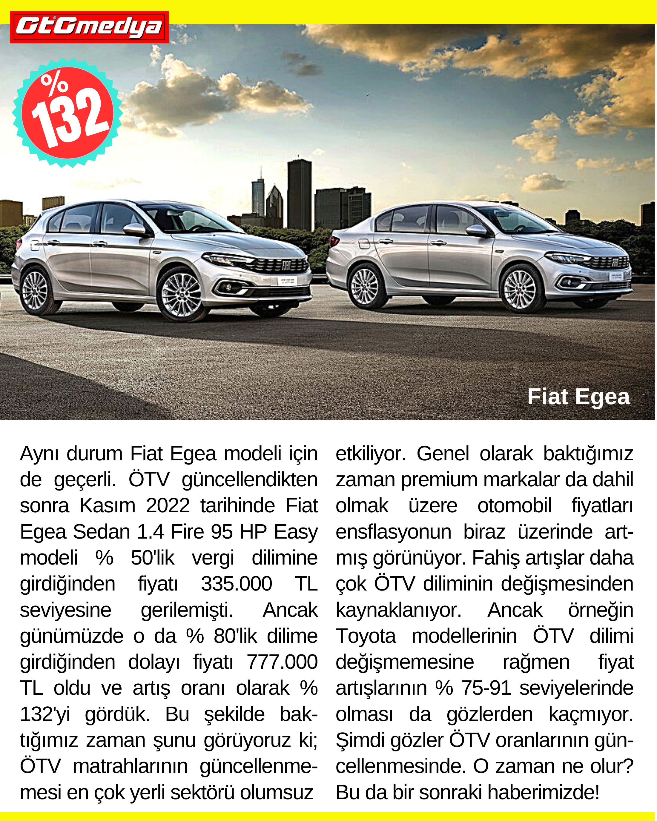 Aynı durum Fiat Egea modeli için de geçerli. ÖTV güncellendikten sonra Kasım 2022 tarihinde Fiat Egea Sedan 1.4 Fire 95 HP Easy modeli % 50'lik vergi dilimine girdiğinden fiyatı 335.000 TL seviyesine gerilemişti. Ancak günümüzde o da % 80'lik dilime girdiğinden dolayı fiyatı 777.000 TL oldu ve artış oranı olarak % 132'yi gördük. Bu şekilde baktığımız zaman şunu görüyoruz ki; ÖTV matrahlarının güncellenmemesi en çok yerli sektörü olumsuz etkiliyor.