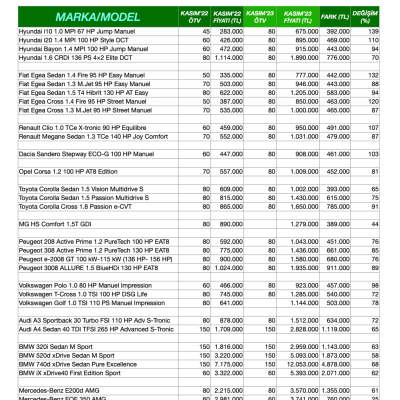 Genel olarak baktığımız zaman premium markalar da dahil olmak üzere otomobil fiyatları ensflasyonun biraz üzerinde artmış görünüyor. Fahiş artışlar daha çok ÖTV diliminin değişmesinden kaynaklanıyor. Ancak örneğin Toyota modellerinin ÖTV dilimi değişmemesine rağmen fiyat artışlarının % 75-91 seviyelerinde olması da gözlerden kaçmıyor. Şimdi gözler ÖTV oranlarının güncellenmesinde. O zaman ne olur? Bu da bir sonraki haberimizde!