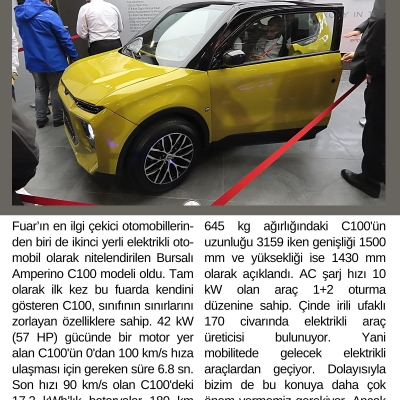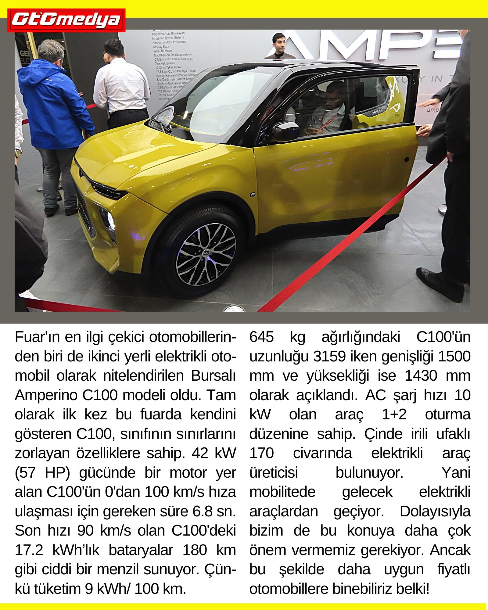 Fuar’ın en ilgi çekici otomobillerin-den biri de ikinci yerli elektrikli oto-mobil olarak nitelendirilen Bursalı Amperino C100 modeli oldu. Tam olarak ilk kez bu fuarda kendini gösteren C100, sınıfının sınırlarını zorlayan özelliklere sahip. 42 kW (57 HP) gücünde bir motor yer alan C100'ün 0'dan 100 km/s hıza ulaşması için gereken süre 6.8 sn. Son hızı 90 km/s olan C100'deki 17.2 kWh’lık bataryalar 180 km gibi ciddi bir menzil sunuyor. Çünkü tüketim sadece 9 kWh/ 100 km.