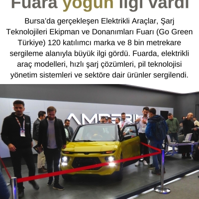 Bursa’da gerçekleşen Elektrikli Araçlar, Şarj Teknolojileri Ekipman ve Donanımları Fuarı (Go Green Türkiye) 120 katılımcı marka ve 8 bin metrekare sergileme alanıyla büyük ilgi gördü. Fuarda, elektrikli araç modelleri, hızlı şarj çözümleri, pil teknolojisi yönetim sistemleri ve sektöre dair ürünler sergilendi.