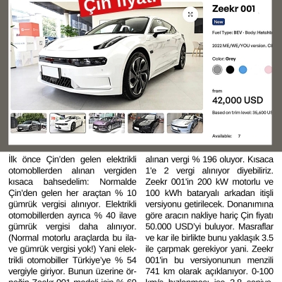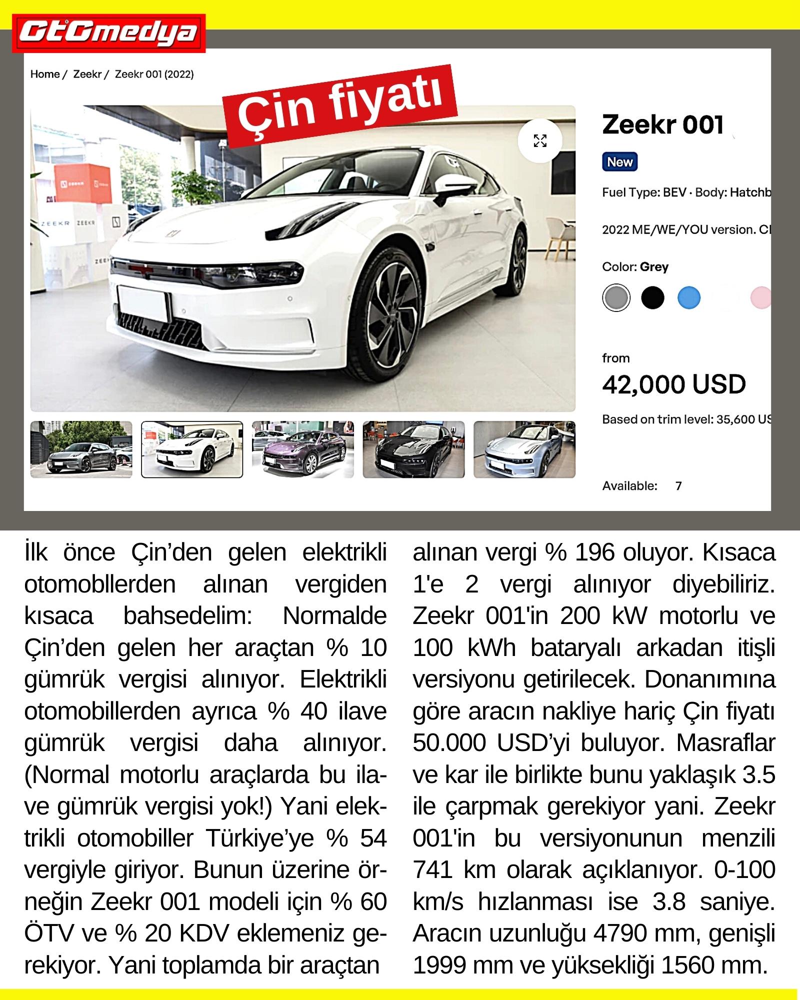 İlk önce Çin’den gelen elektrikli otomobllerden alınan vergiden kısaca bahsedelim: Normalde Çin’den gelen her araçtan % 10 gümrük vergisi alınıyor. Elektrikli otomobillerden ayrıca % 40 ilave gümrük vergisi daha alınıyor. (Normal motorlu araçlarda bu ilave gümrük vergisi yok!) Yani elek-trikli otomobiller Türkiye’ye % 54 vergiyle giriyor. Bunun üzerine örneğin Zeekr 001 modeli için % 60 ÖTV ve % 20 KDV eklemeniz ge-rekiyor. Yani toplamda bir araçtan alınan vergi % 196 oluyor. Kısaca 1'e 2 vergi alınıyor diyebiliriz. Zeekr 001'in 200 kW motorlu ve 100 kWh bataryalı arkadan itişli versiyonu getirilecek. Donanımına göre aracın nakliye hariç Çin fiyatı 50.000 USD’yi buluyor. Masraflar ve kar ile birlikte bunu yaklaşık 3.5 ile çarpmak gerekiyor yani. Zeekr 001'in bu versiyonunun menzili 741 km olarak açıklanıyor. 0-100 km/s hızlanması ise 3.8 saniye. Aracın uzunluğu 4790 mm, genişli 1999 mm ve yüksekliği 1560 mm. Zeekr 001'e sahip olmak için 185.000 USD'yi gözden çıkarmak gerekiyor.