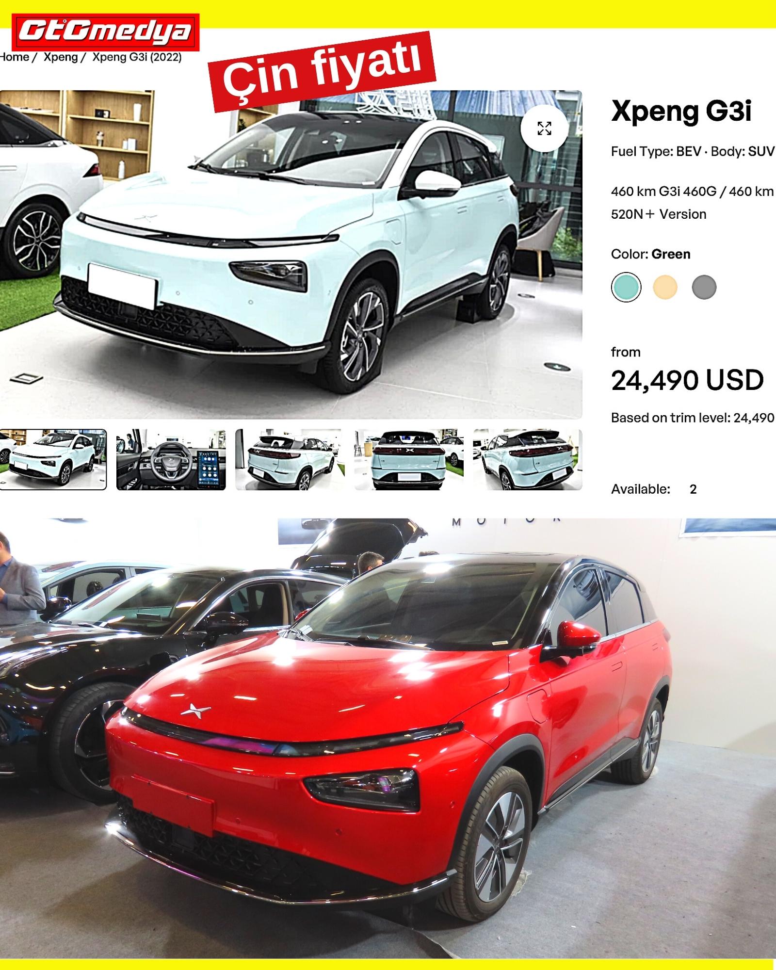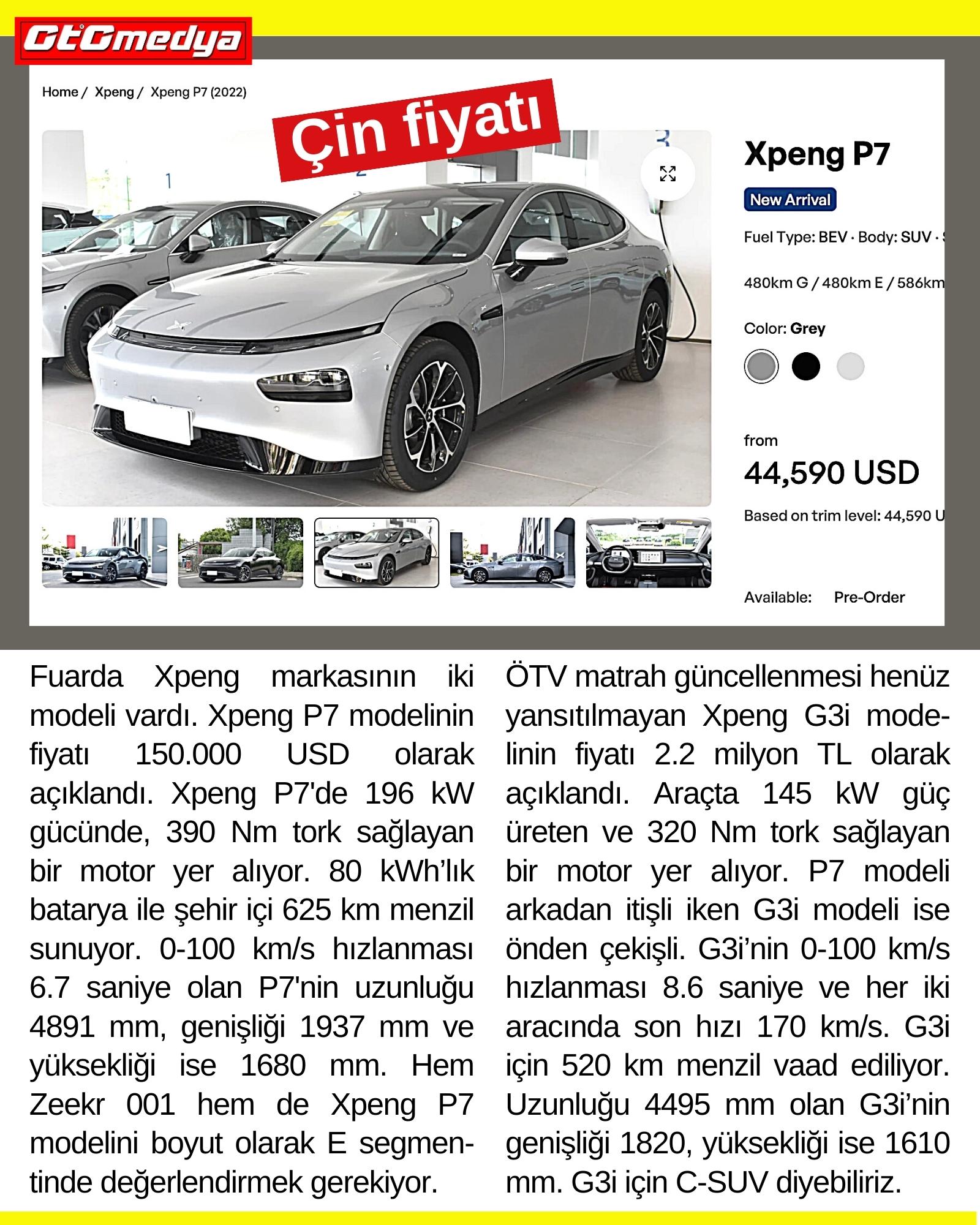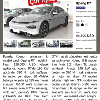 ÖTV matrah güncellenmesi henüz yansıtılmayan Xpeng G3i mode-linin fiyatı 2.2 milyon TL olarak açıklandı. Araçta 145 kW güç üreten ve 320 Nm tork sağlayan bir motor yer alıyor. P7 modeli arkadan itişli iken G3i modeli ise önden çekişli. G3i’nin 0-100 km/s hızlanması 8.6 saniye ve her iki aracında son hızı 170 km/s. G3i için 520 km menzil vaad ediliyor. Uzunluğu 4495 mm olan G3i’nin genişliği 1820, yüksekliği ise 1610 mm. G3i için C-SUV diyebiliriz.