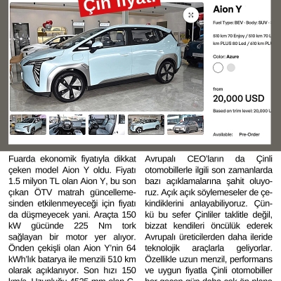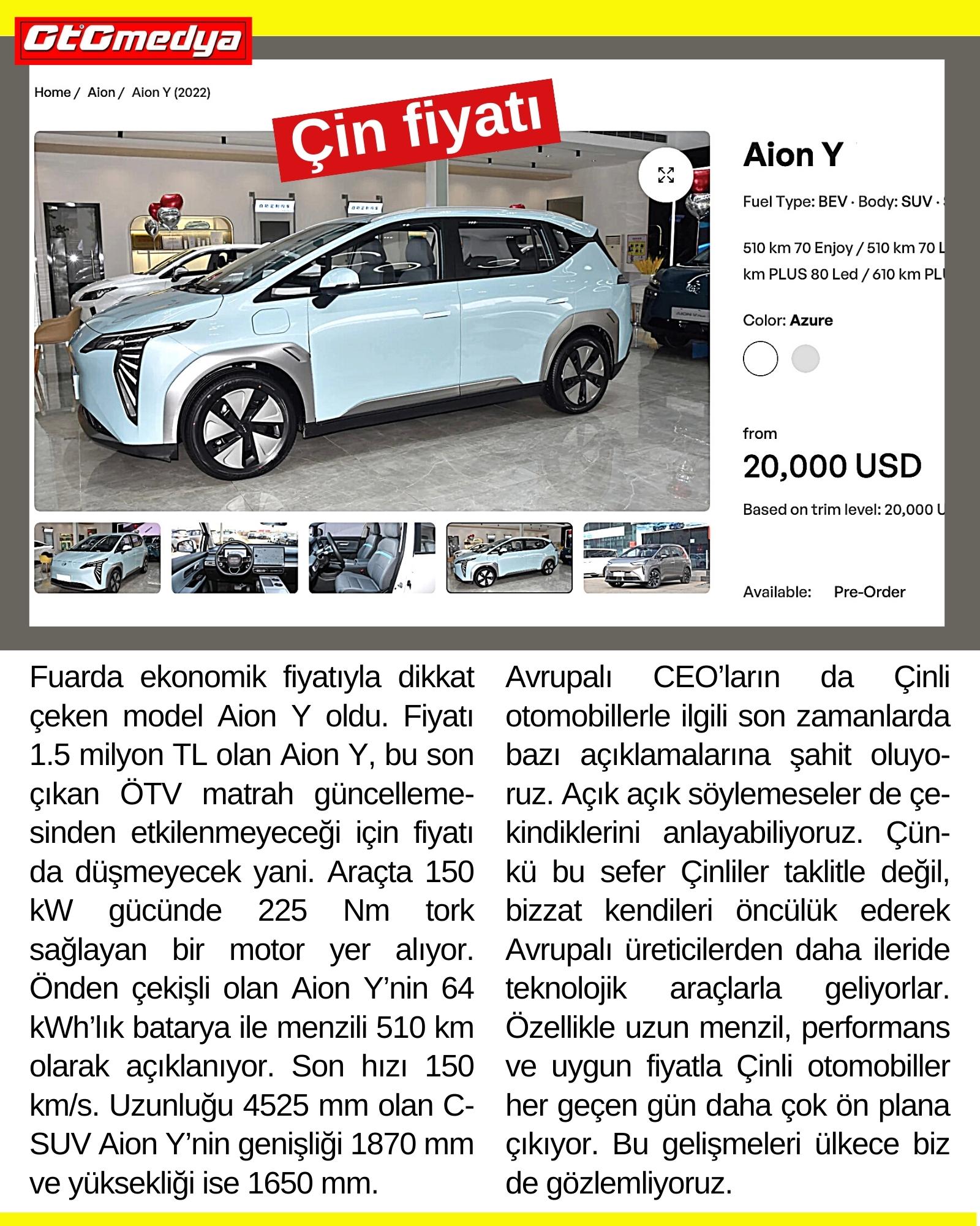 Fuarda ekonomik fiyatıyla dikkat çeken model Aion Y oldu. Fiyatı 1.5 milyon TL olan Aion Y, bu son çıkan ÖTV matrah güncelleme-sinden etkilenmeyeceği için fiyatı da düşmeyecek yani. Araçta 150 kW gücünde 225 Nm tork sağlayan bir motor yer alıyor. Önden çekişli olan Aion Y’nin 64 kWh’lık batarya ile menzili 510 km olarak açıklanıyor. Son hızı 150 km/s. Uzunluğu 4525 mm olan C- SUV Aion Y’nin genişliği 1870 mm ve yüksekliği ise 1650 mm.