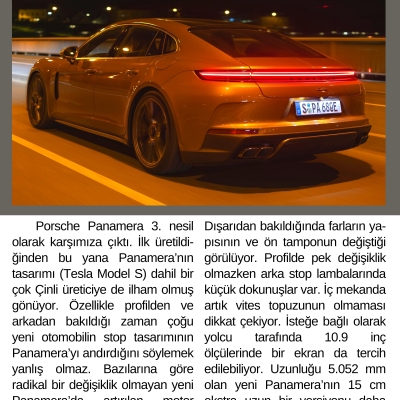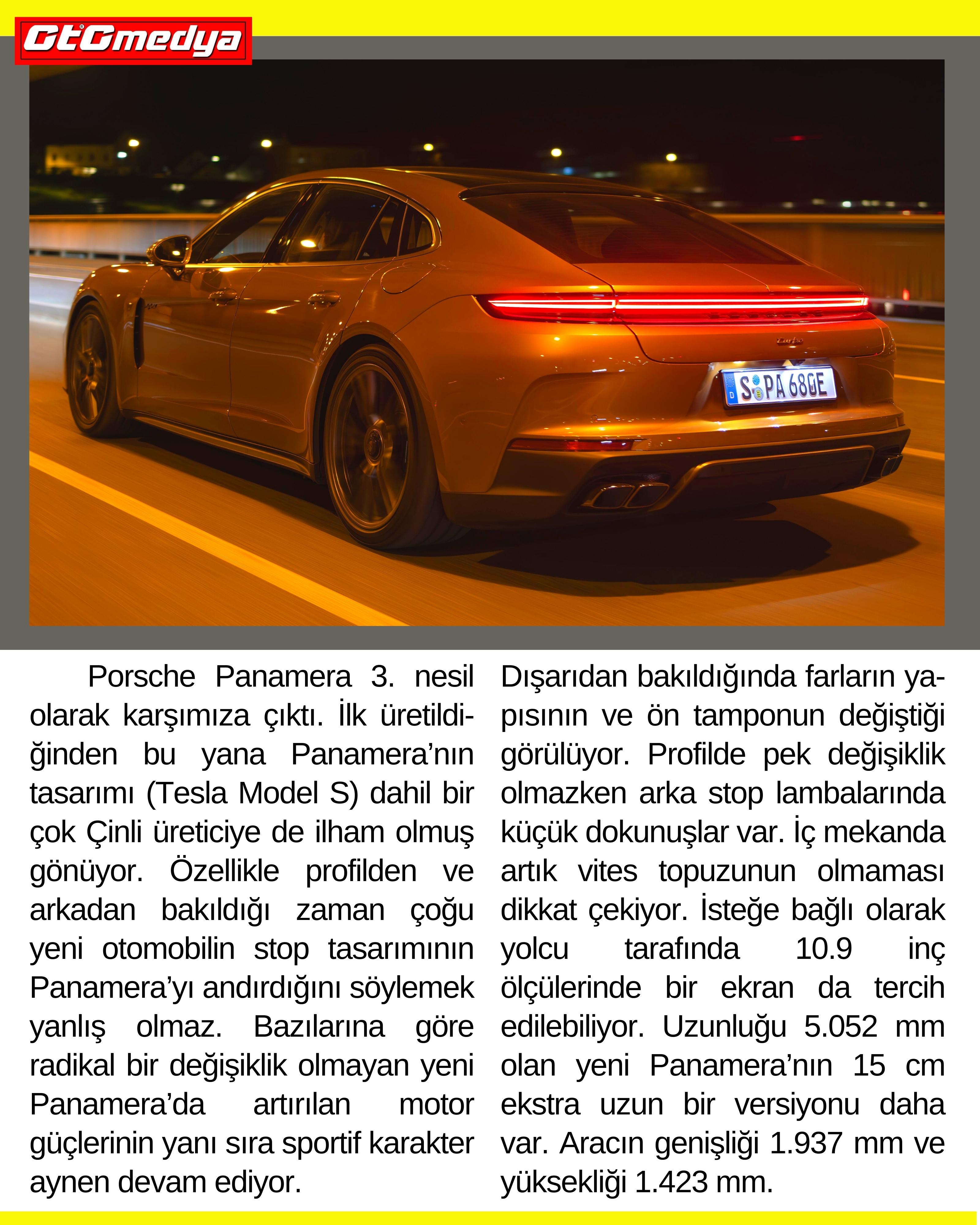 Porsche Panamera 3. nesil olarak karşımıza çıktı. İlk üretildiğinden bu yana Panamera’nın tasarımı (Tesla Model S) dahil bir çok Çinli üreticiye de ilham olmuş gönüyor. Özellikle profilden ve arkadan bakıldığı zaman çoğu yeni otomobilin stop tasarımının Panamera’yı andırdığını söylemek yanlış olmaz. Bazılarına göre radikal bir değişiklik olmayan yeni Panamera’da artırılan motor güçlerinin yanı sıra sportif karakter aynen devam ediyor.