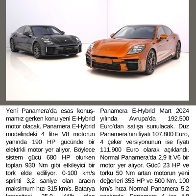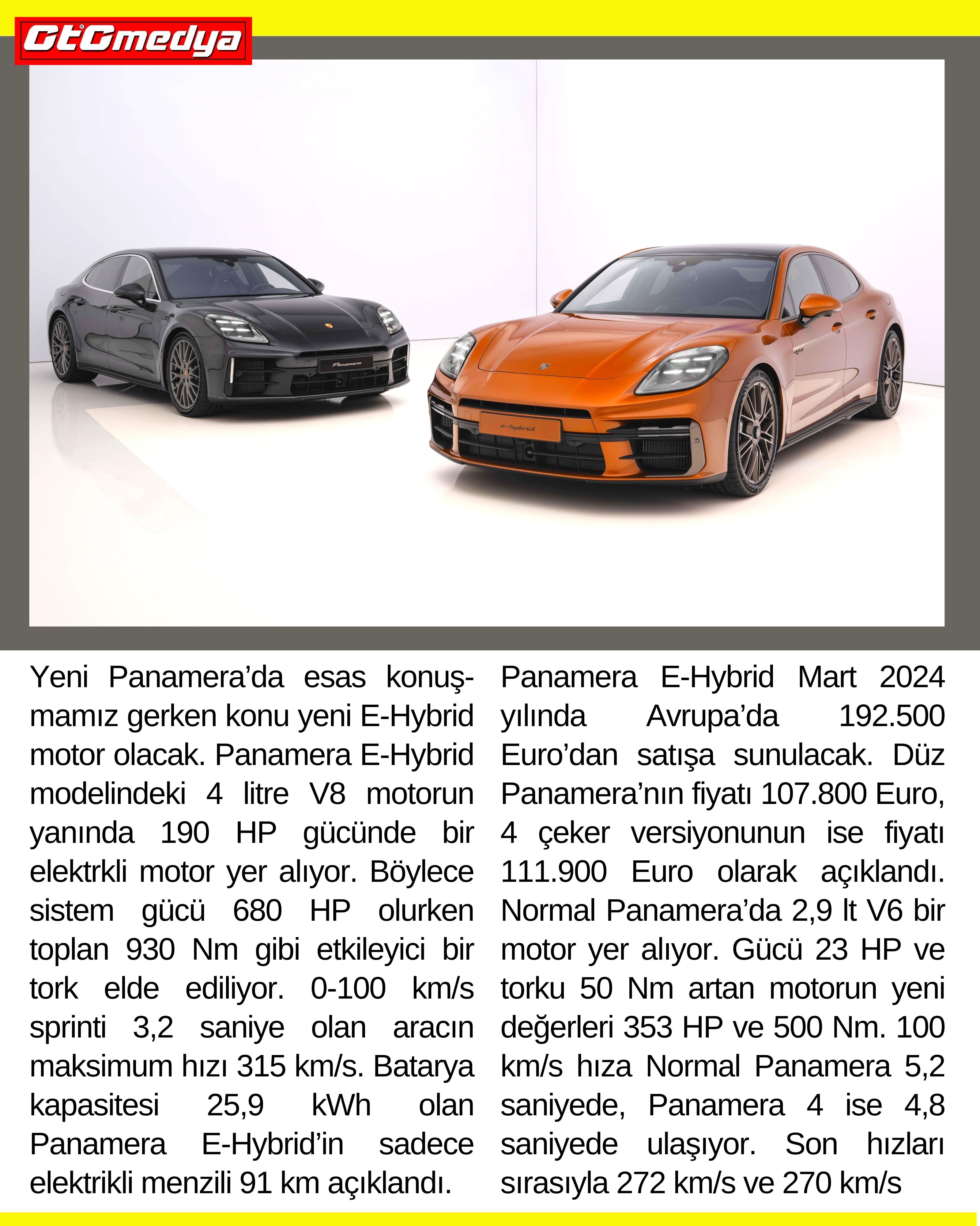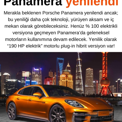 Merakla beklenen Porsche Panamera yenilendi ancak; bu yeniliği daha çok teknoloji, yürüyen aksam ve iç mekan olarak görebileceksiniz. Henüz % 100 elektrikli versiyona geçmeyen Panamera’da geleneksel motorların kullanımına devam edilecek. Yenilik olarak “190 HP elektrik” motorlu plug-in hibrit versiyon var!