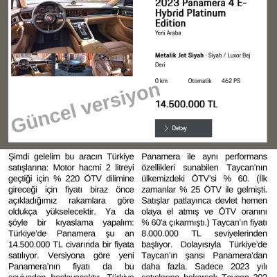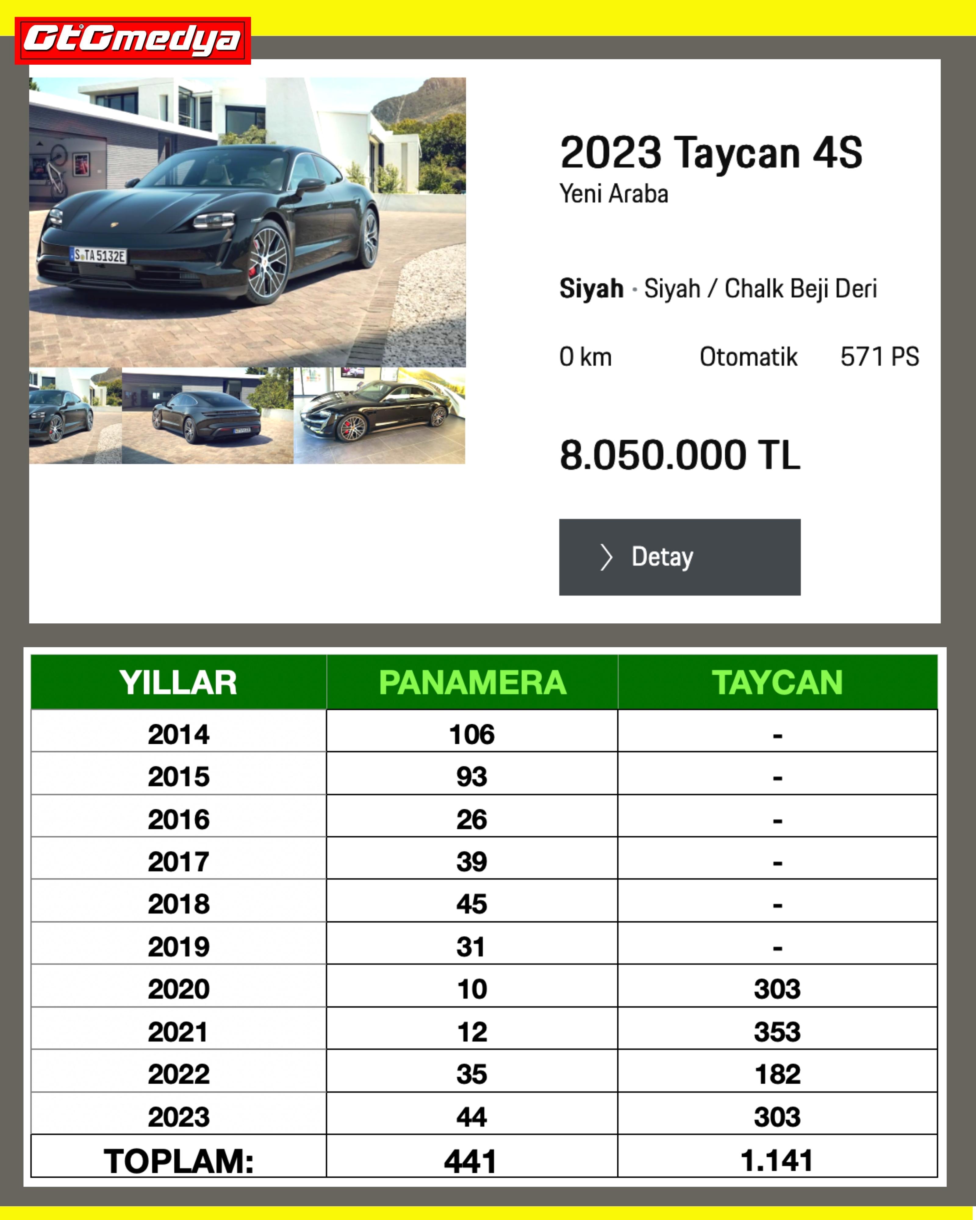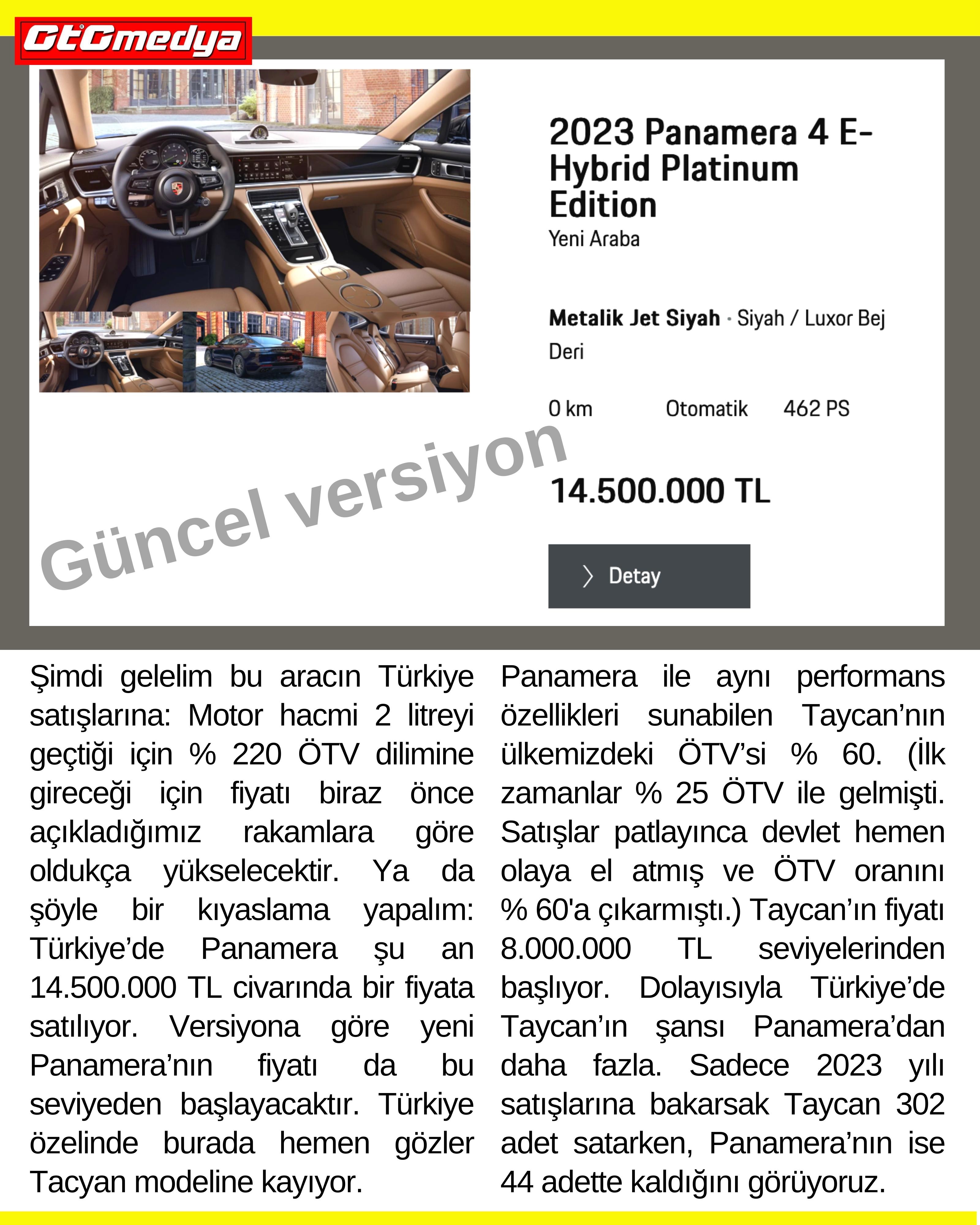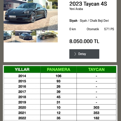 Panamera ile aynı performans özellikleri sunabilen Taycan’nın ülkemizdeki ÖTV’si % 60. (İlk zamanlar % 25 ÖTV ile gelmişti. Satışlar patlayınca devlet hemen olaya el atmış ve ÖTV oranını % 60'a çıkarmıştı.) Taycan’ın fiyatı 8.000.000 TL seviyelerinden başlıyor. Dolayısıyla Türkiye’de Taycan’ın şansı Panamera’dan daha fazla. Sadece 2023 yılı satışlarına bakarsak Taycan 302 adet satarken, Panamera’nın ise 44 adette kaldığını görüyoruz.