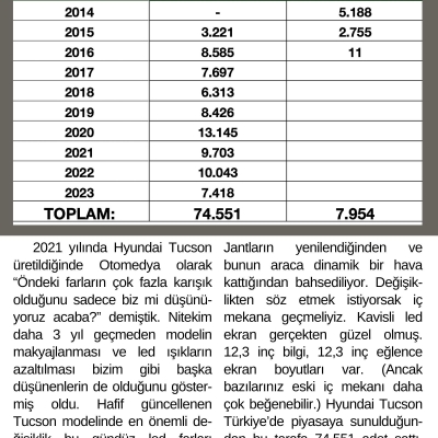 Jantların yenilendiğinden ve bunun araca dinamik bir hava kattığından bahsediliyor. Değişiklikten söz etmek istiyorsak iç mekana geçmeliyiz. Kavisli led ekran gerçekten güzel olmuş. 12,3 inç bilgi, 12,3 inç eğlence ekran boyutları var. (Ancak bazılarınız eski iç mekanı daha çok beğenebilir.) Hyundai Tucson Türkiye’de piyasaya sunulduğun-dan bu tarafa 74.551 adet sattı. 2022 yılında AB’de 1. oldu ama Türkiye’de 4. olabildi.