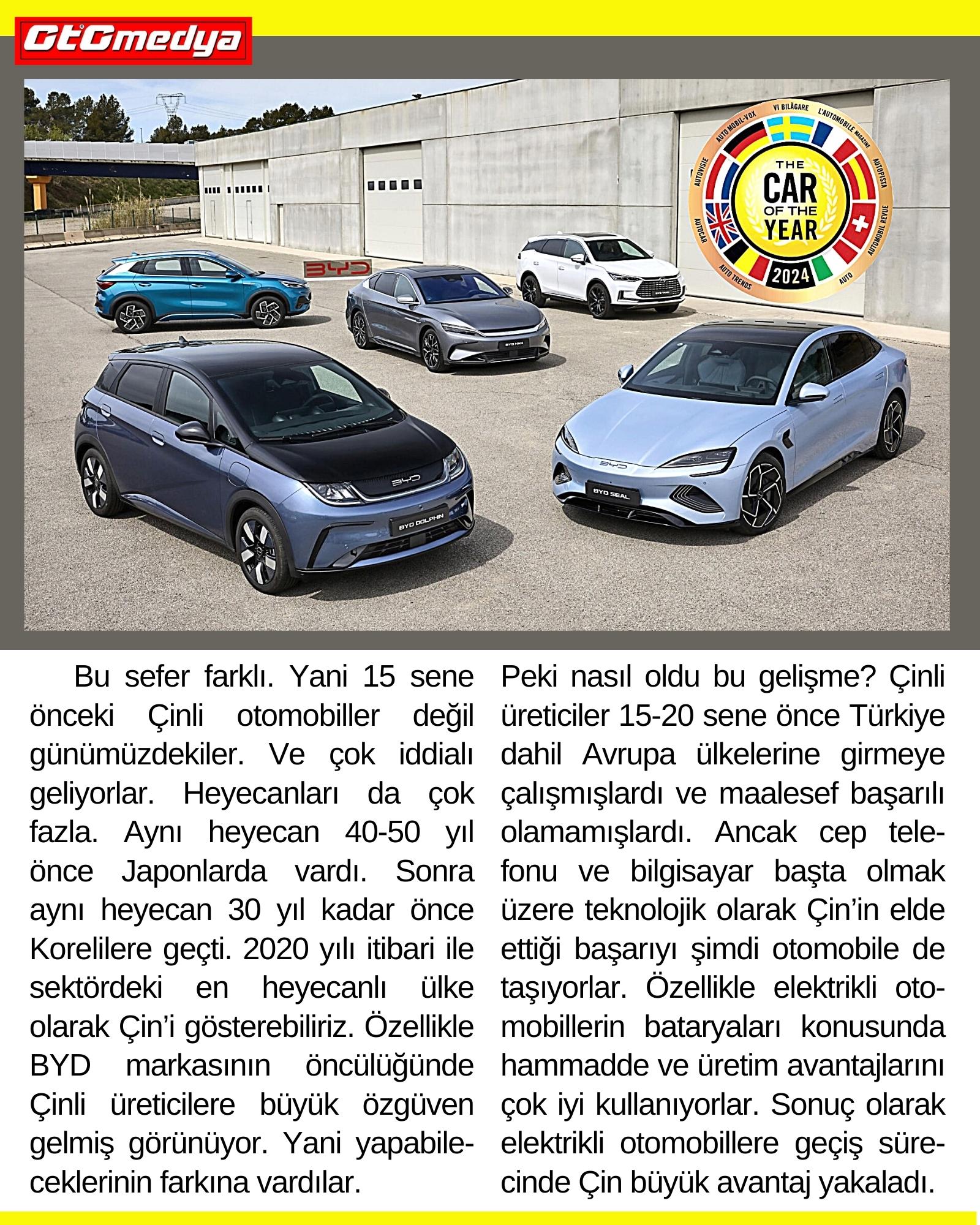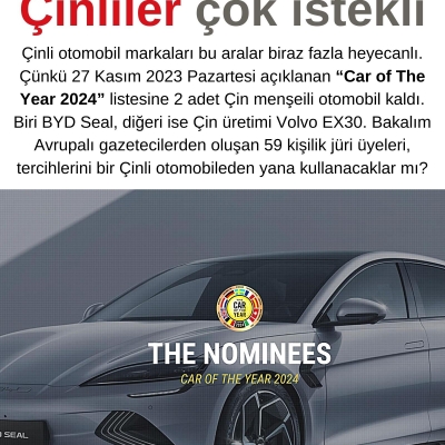 Çinli otomobil markaları bu aralar biraz fazla heyecanlı. Çünkü 27 Kasım 2023 Pazartesi açıklanan “Car of The Year 2024” listesine 2 adet Çin menşeili otomobil kaldı. Biri BYD Seal, diğeri ise Çin üretimi Volvo EX30. Bakalım Avrupalı gazetecilerden oluşan 59 kişilik jüri üyeleri, tercihlerini bir Çinli otomobileden yana kullanacaklar mı?