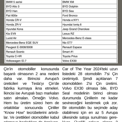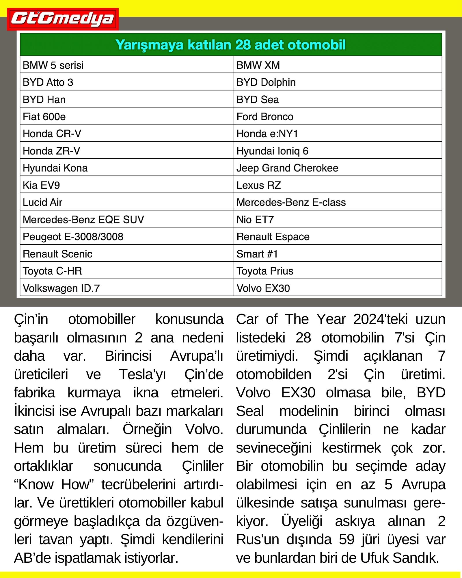 Car of The Year 2024'teki uzun listedeki 28 otomobilin 7'si Çin üretimiydi. Şimdi açıklanan 7 otomobilden 2'si Çin üretimi. Volvo EX30 olmasa bile, BYD Seal modelinin birinci olması durumunda Çinlilerin ne kadar sevineceğini kestirmek çok zor. Bir otomobilin bu seçimde aday olabilmesi için en az 5 Avrupa ülkesinde satışa sunulması gere-kiyor. Üyeliği askıya alınan 2 Rus’un dışında 59 jüri üyesi var ve bunlardan biri de Ufuk Sandık.