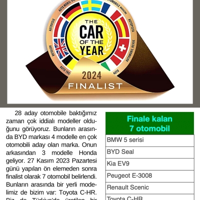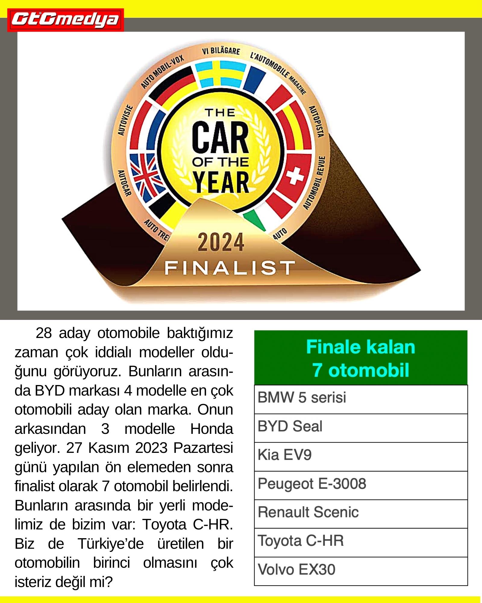28 aday otomobile baktığımız zaman çok iddialı modeller olduğunu görüyoruz. Bunların arasında BYD markası 4 modelle en çok otomobili aday olan marka. Onun arkasından 3 modelle Honda geliyor. 27 Kasım 2023 Pazartesi günü yapılan ön elemeden sonra finalist olarak 7 otomobil belirlendi. Bunların arasında bir yerli mode-limiz de bizim var: Toyota C-HR. Biz de Türkiye’de üretilen bir otomobilin birinci olmasını çok isteriz değil mi?
