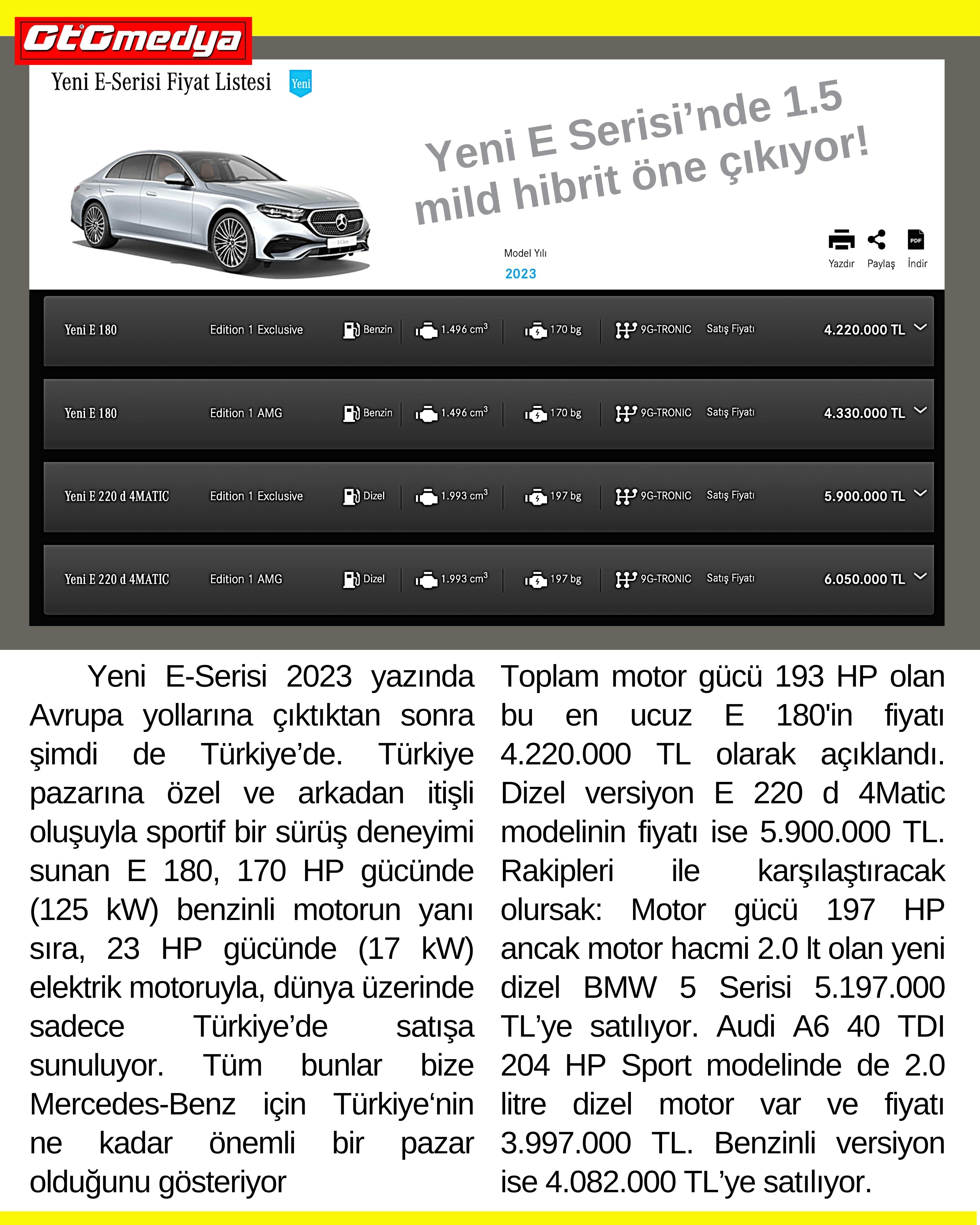 Yeni E-Serisi 2023 yazında Avrupa yollarına çıktıktan sonra şimdi de Türkiye’de. Türkiye pazarına özel ve arkadan itişli oluşuyla sportif bir sürüş deneyimi sunan E 180, 170 HP gücünde (125 kW) benzinli motorun yanı sıra, 23 HP gücünde (17 kW) elektrik motoruyla, dünya üzerinde sadece Türkiye’de satışa sunuluyor. Tüm bunlar bize Mercedes-Benz için Türkiye‘nin ne kadar önemli bir pazar olduğunu gösteriyor.