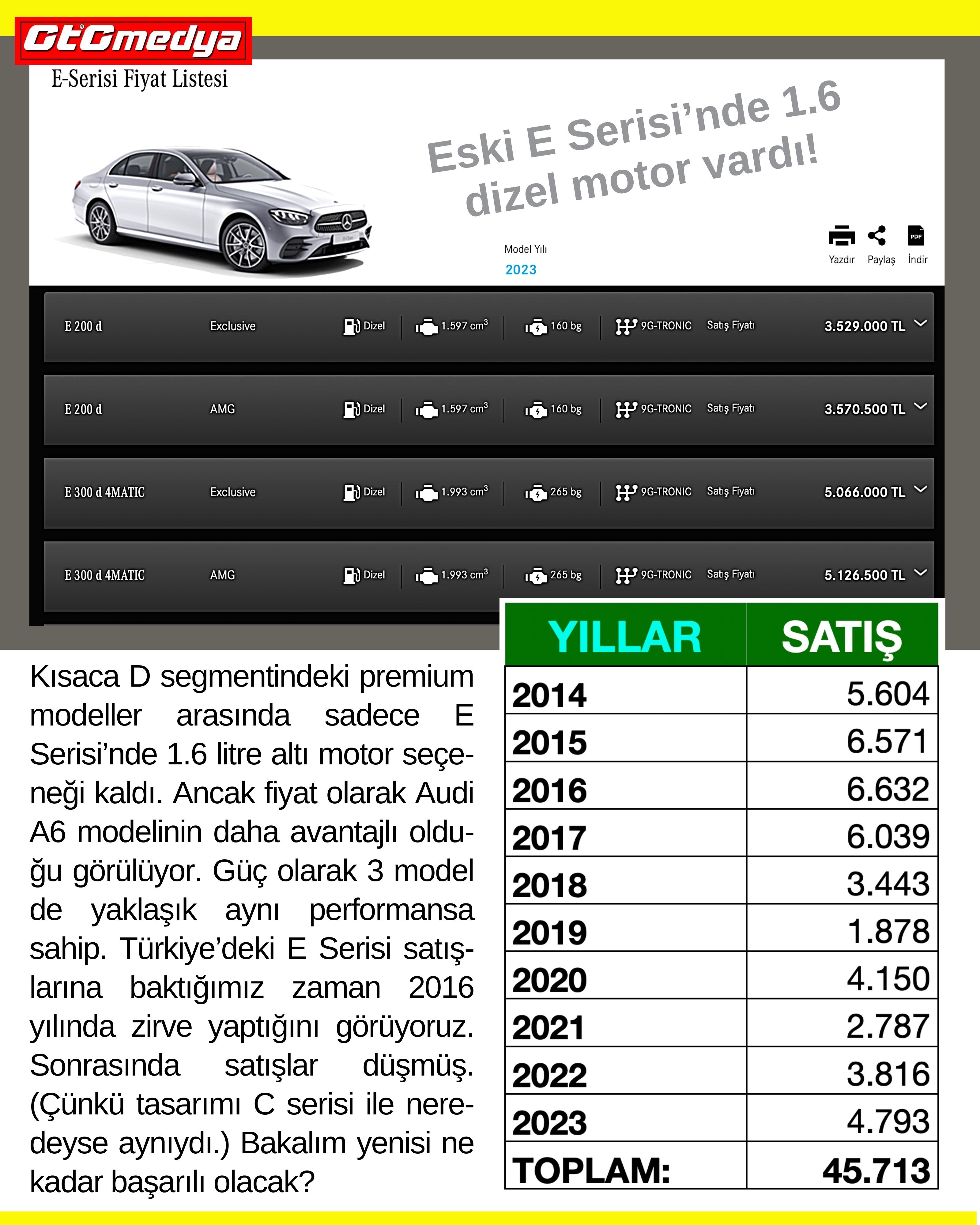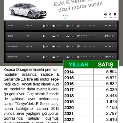 Kısaca D segmentindeki premium modeller arasında sadece Mercedes-Benz E Serisi’nde 1.6 litre altı motor seçeneği kaldı. Ancak fiyat olarak Audi A6 modelinin daha avantajlı olduğu görülüyor. Güç olarak 3 model de yaklaşık aynı performansa sahip. Türkiye’deki E Serisi satışlarına baktığımız zaman 2016 yılında zirve yaptığını görüyoruz. Sonrasında satışlar düşmüş. (Çünkü tasarımı C serisi ile neredeyse aynıydı. Önceden E Serisi'nin farklı ve beğenilen bir tasarımı vardı.) Bakalım yenisi ne kadar başarılı olacak?