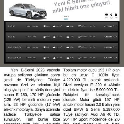 Toplam motor gücü 193 HP olan bu en ucuz E 180'in fiyatı 4.220.000 TL olarak açıklandı. Dizel versiyon E 220 d 4Matic modelinin fiyatı ise 5.900.000 TL. Rakipleri ile karşılaştıracak olursak: Motor gücü 197 HP ancak motor hacmi 2.0 lt olan yeni dizel BMW 5 Serisi 5.197.000 TL’ye satılıyor. Audi A6 40 TDI 204 HP Sport modelinde de 2.0 litre dizel motor var ve fiyatı 3.997.000 TL. Benzinli versiyon ise 4.082.000 TL’ye satılıyor.