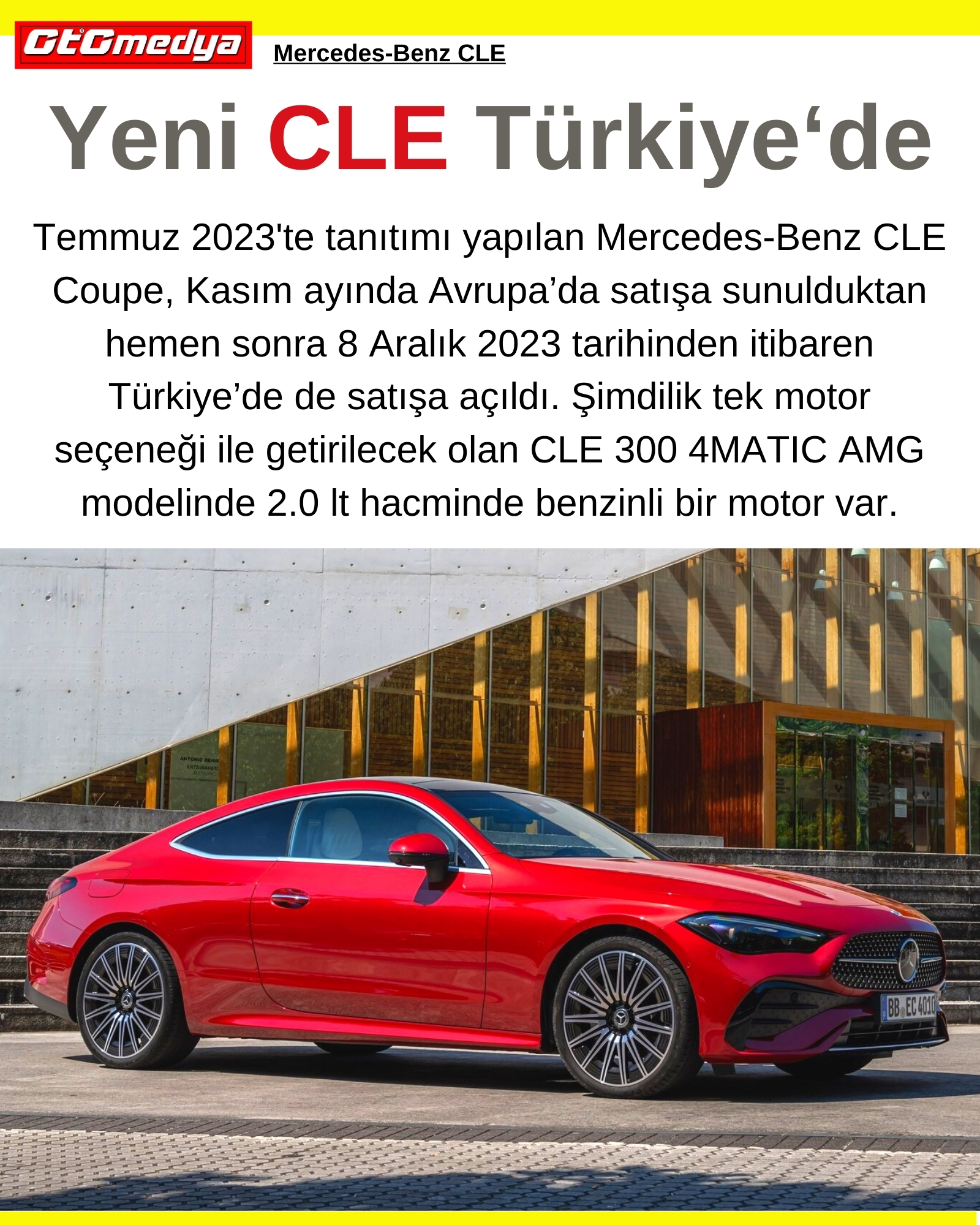 Temmuz 2023'te tanıtımı yapılan Mercedes-Benz CLE Coupe, Kasım ayında Avrupa’da satışa sunulduktan hemen sonra 8 Aralık 2023 tarihinden itibaren Türkiye’de de satışa açıldı. Şimdilik tek motor seçeneği ile getirilecek olan CLE 300 4MATIC AMG modelinde 2.0 lt hacminde benzinli bir motor var.