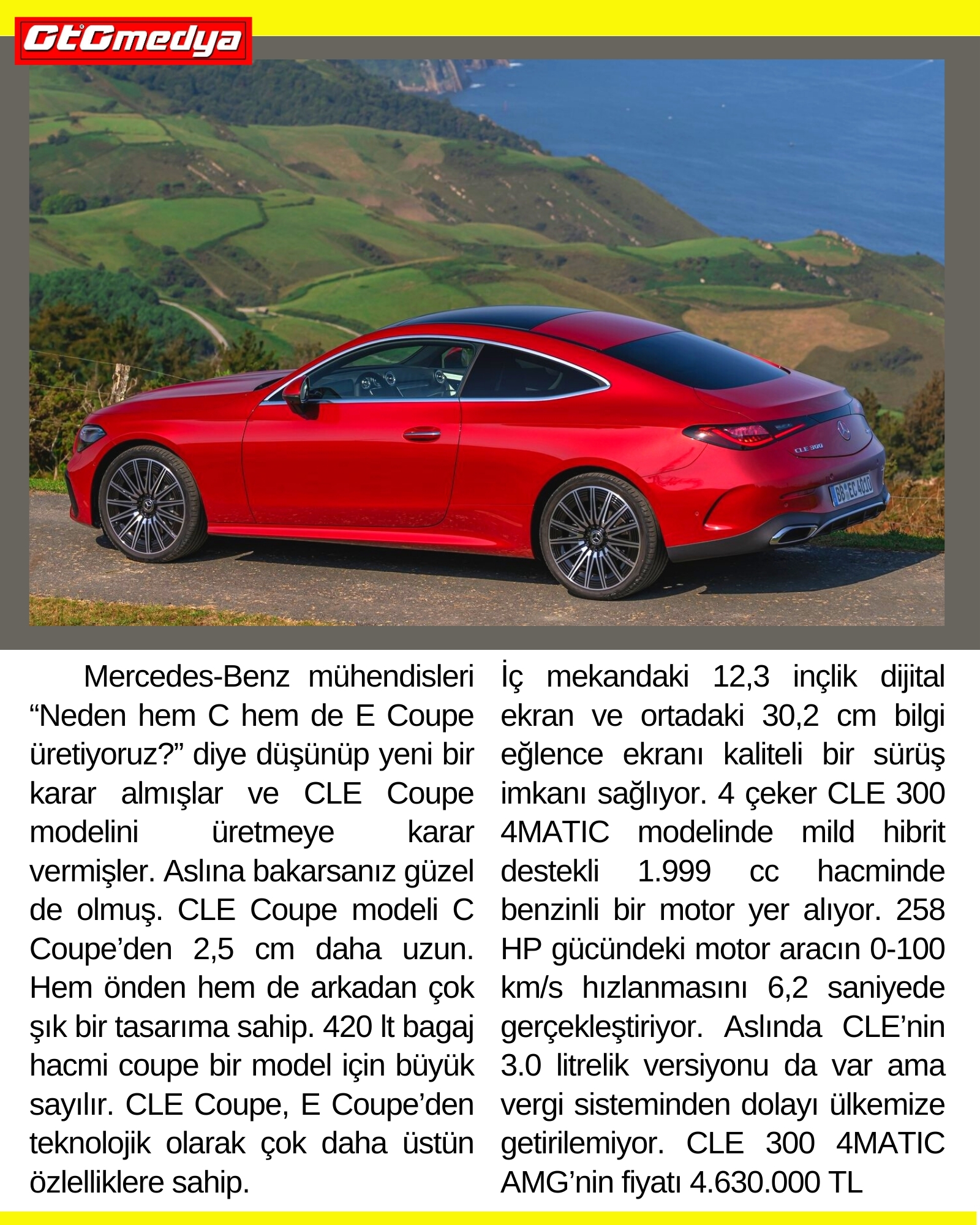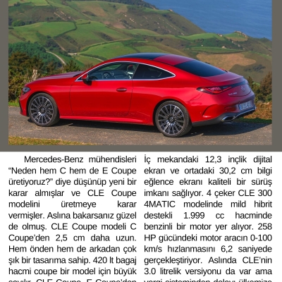 Mercedes-Benz mühendisleri “Neden hem C hem de E Coupe üretiyoruz?” diye düşünüp yeni bir karar almışlar ve CLE Coupe modelini üretmeye karar vermişler. Aslına bakarsanız güzel de olmuş. CLE Coupe modeli C Coupe’den 2,5 cm daha uzun. Hem önden hem de arkadan çok şık bir tasarıma sahip. 420 lt bagaj hacmi coupe bir model için büyük sayılır. CLE Coupe, E Coupe’den teknolojik olarak çok daha üstün özlelliklere sahip.