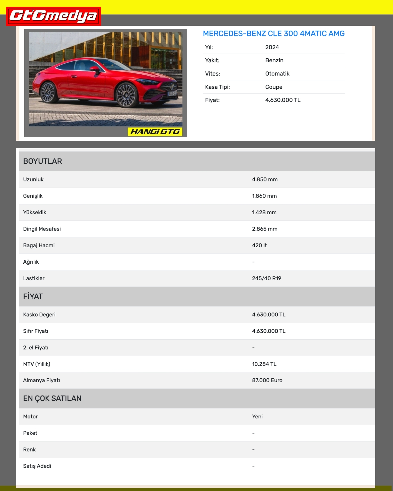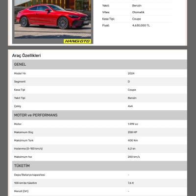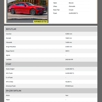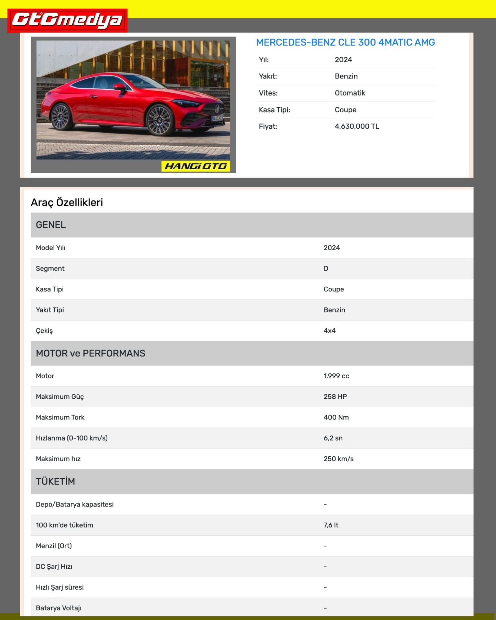 İç mekandaki 12,3 inçlik dijital ekran ve ortadaki 30,2 cm bilgi eğlence ekranı kaliteli bir sürüş imkanı sağlıyor. 4 çeker CLE 300 4MATIC modelinde mild hibrit destekli 1.999 cc hacminde benzinli bir motor yer alıyor. 258 HP gücündeki motor aracın 0-100 km/s hızlanmasını 6,2 saniyede gerçekleştiriyor. Aslında CLE’nin 3.0 litrelik versiyonu da var ama vergi sisteminden dolayı ülkemize getirilemiyor. CLE 300 4MATIC AMG’nin fiyatı 4.630.000 TL