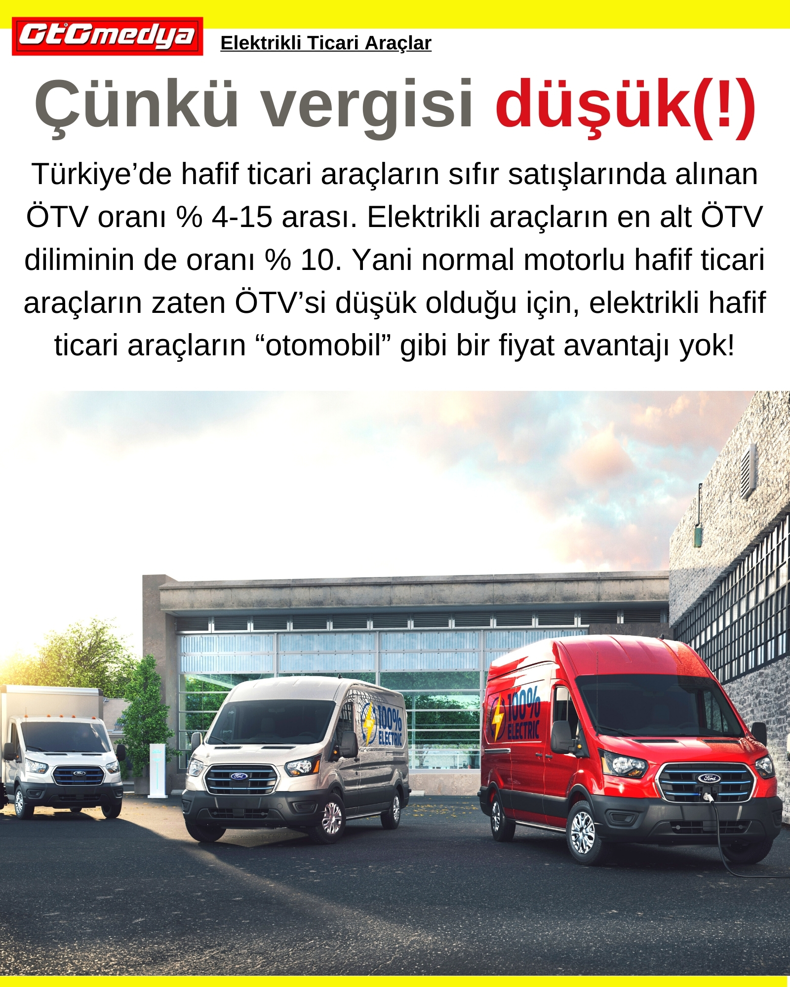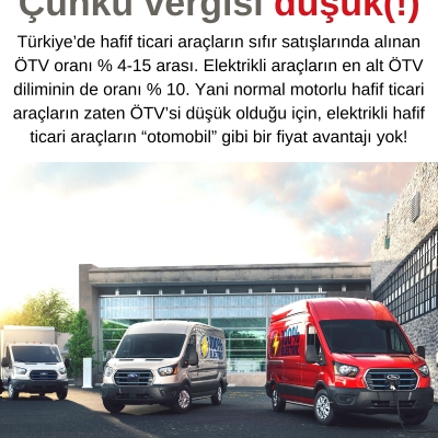 Türkiye’de hafif ticari araçların sıfır satışlarında alınan ÖTV oranı % 4-15 arası. Elektrikli araçların en alt ÖTV diliminin de oranı % 10. Yani normal motorlu hafif ticari araçların zaten ÖTV’si düşük olduğu için, elektrikli hafif ticari araçların “otomobil” gibi bir fiyat avantajı yok!