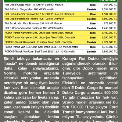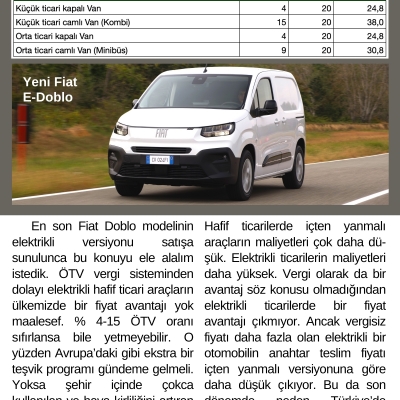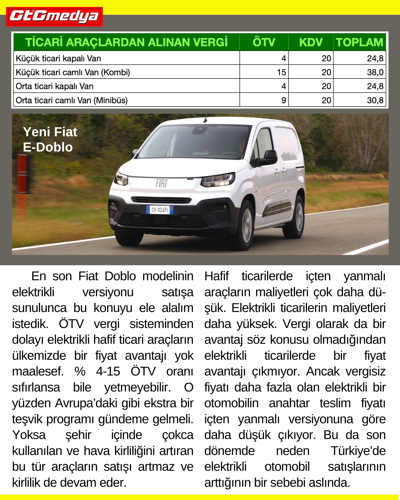 En son Fiat Doblo modelinin elektrikli versiyonu satışa sunulunca bu konuyu ele alalım istedik. ÖTV vergi sisteminden dolayı elektrikli hafif ticari araçların ülkemizde bir fiyat avantajı yok maalesef. % 4-15 ÖTV oranı sıfırlansa bile yetmeyebilir. O yüzden Avrupa’daki gibi ekstra bir teşvik programı gündeme gelmeli. Yoksa şehir içinde çokça kullanılan ve hava kirliliğini artıran bu tür araçların satışı artmaz ve kirlilik de devam eder.