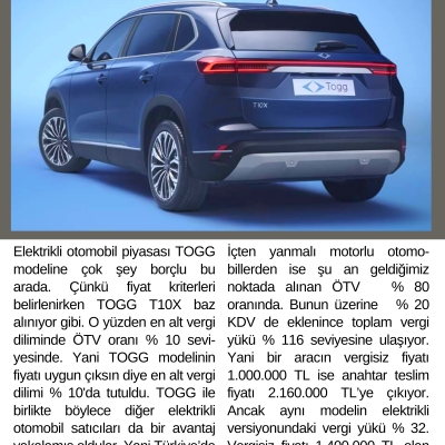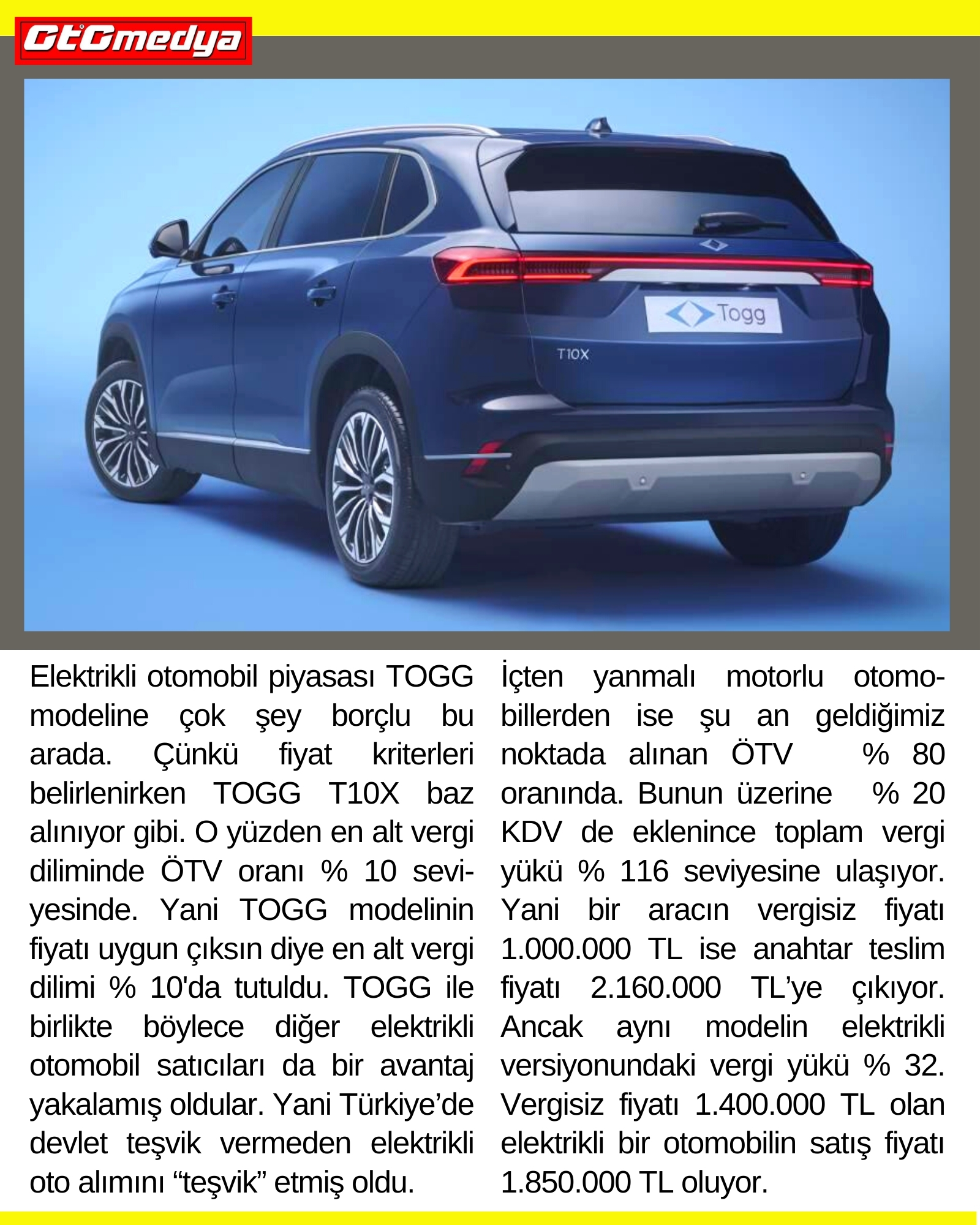 Elektrikli otomobil piyasası TOGG modeline çok şey borçlu bu arada. Çünkü fiyat kriterleri belirlenirken TOGG T10X baz alınıyor gibi. O yüzden en alt vergi diliminde ÖTV oranı % 10 sevi-yesinde. Yani TOGG modelinin fiyatı uygun çıksın diye en alt vergi dilimi % 10'da tutuldu. TOGG ile birlikte böylece diğer elektrikli otomobil satıcıları da bir avantaj yakalamış oldular. Yani Türkiye’de devlet teşvik vermeden elektrikli oto alımını “teşvik” etmiş oldu.