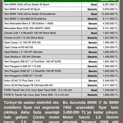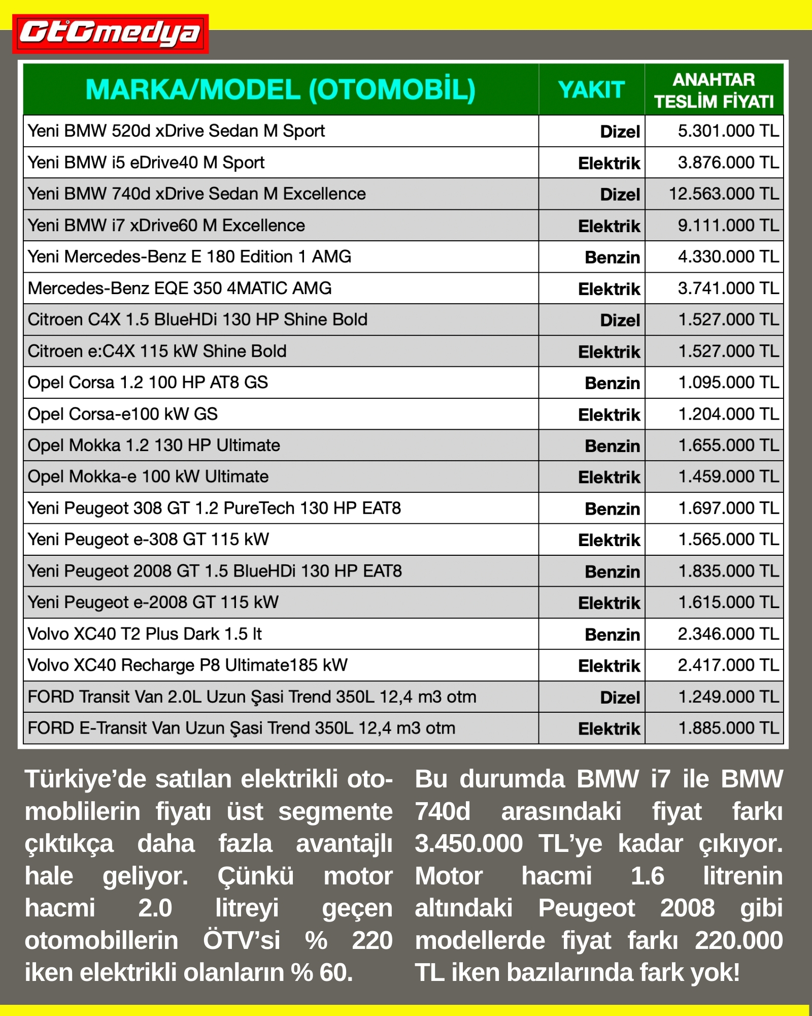 Türkiye’de satılan elektrikli otomobillerin fiyatı üst segmente çıktıkça daha fazla avantajlı hale geliyor. Çünkü motor hacmi 2.0 litreyi geçen otomobillerin ÖTV’si % 220 iken elektrikli olanların % 60. Bu durumda BMW i7 ile BMW 740d arasındaki fiyat farkı 3.450.000 TL’ye kadar çıkıyor. Motor hacmi 1.6 litrenin altındaki Peugeot 2008 gibi modellerde fiyat farkı 220.000 TL iken bazılarında fark yok!