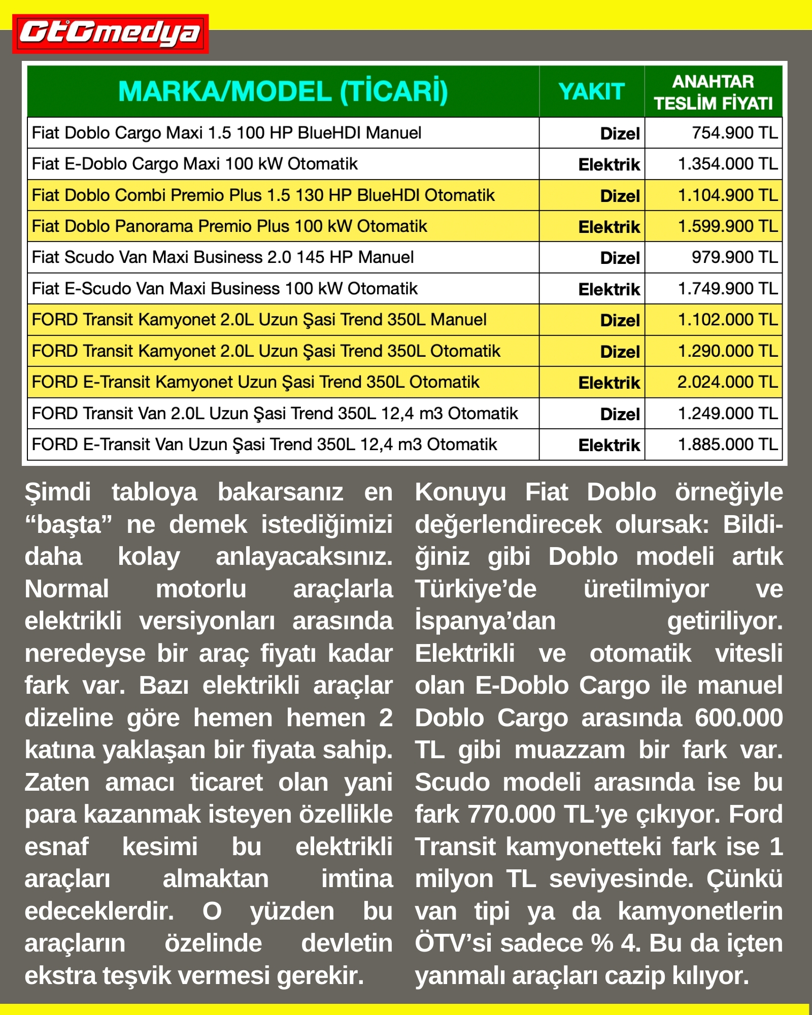 Konuyu Fiat Doblo örneğiyle değerlendirecek olursak: Bildiğiniz gibi Doblo modeli artık Türkiye’de üretilmiyor ve İspanya’dan getiriliyor. Elektrikli ve otomatik vitesli olan E-Doblo Cargo ile manuel Doblo Cargo arasında 600.000 TL gibi muazzam bir fark var. Scudo modeli arasında ise bu fark 770.000 TL’ye çıkıyor. Ford Transit kamyonetteki fark ise 1 milyon TL seviyesinde. Çünkü van tipi ya da kamyonetlerin ÖTV’si sadece % 4. Bu da içten yanmalı araçları cazip kılıyor.