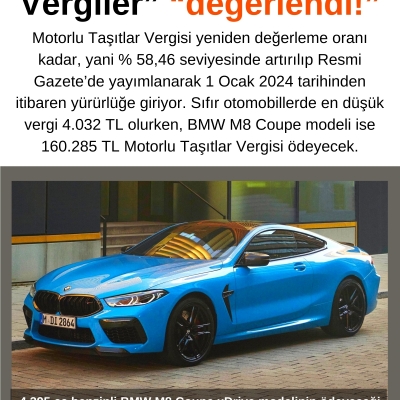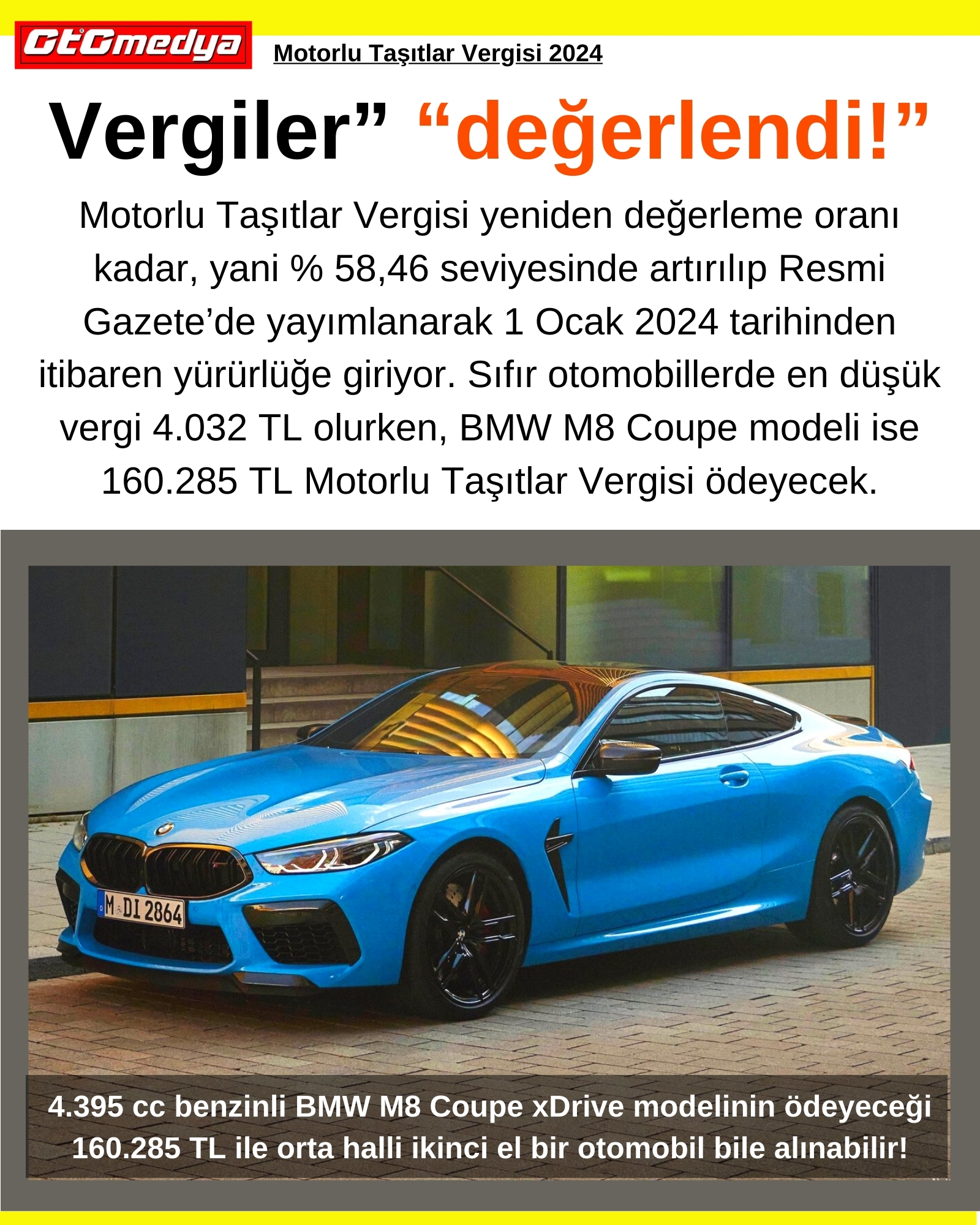 Motorlu Taşıtlar Vergisi yeniden değerleme oranı kadar, yani % 58,46 seviyesinde artırılıp Resmi Gazete’de yayımlanarak 1 Ocak 2024 tarihinden itibaren yürürlüğe giriyor. Sıfır otomobillerde en düşük vergi 4.032 TL olurken, BMW M8 Coupe modeli ise 160.285 TL Motorlu Taşıtlar Vergisi ödeyecek.