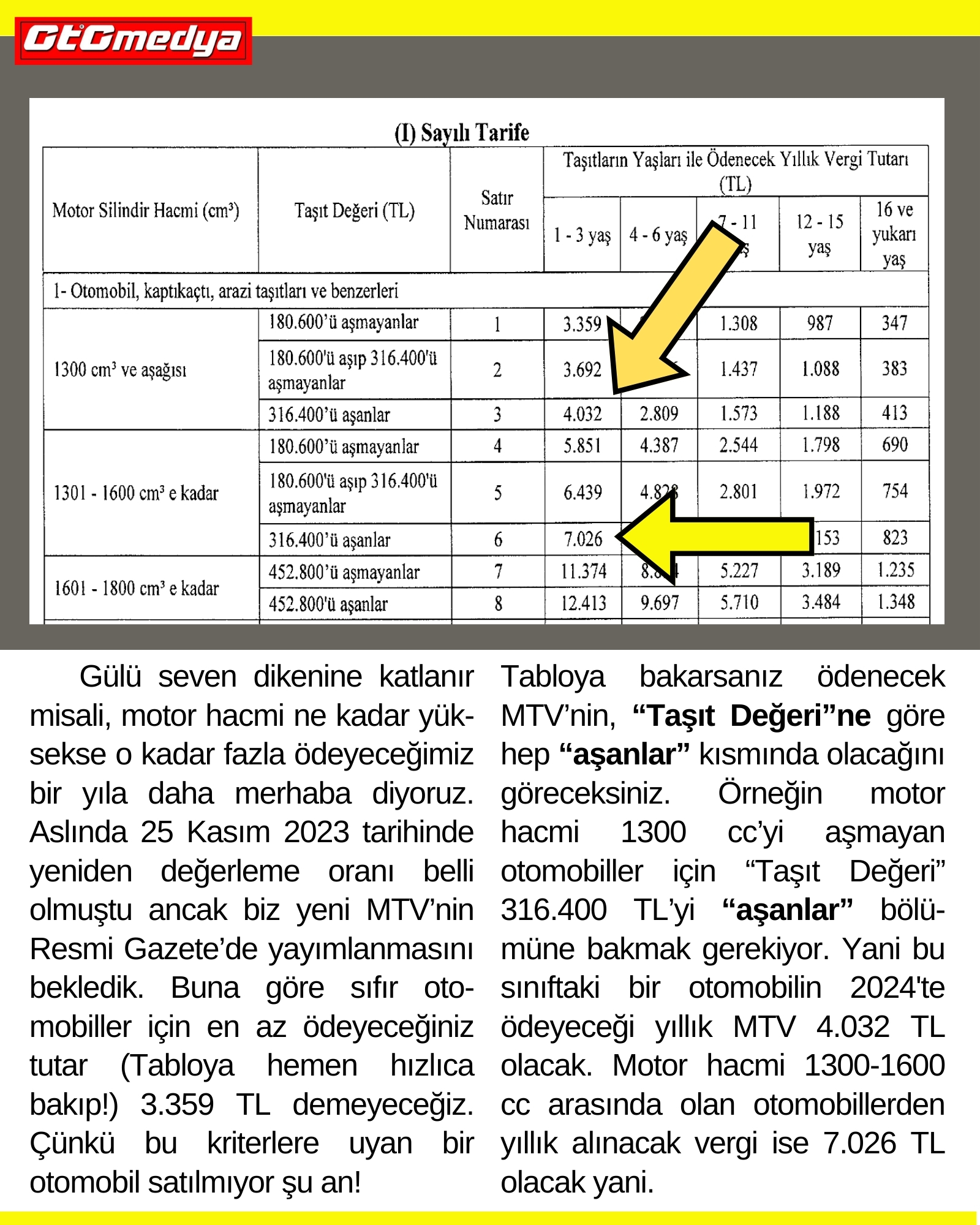 Gülü seven dikenine katlanır misali, motor hacmi ne kadar yük-sekse o kadar fazla ödeyeceğimiz bir yıla daha merhaba diyoruz. Aslında 25 Kasım 2023 tarihinde yeniden değerleme oranı belli olmuştu ancak biz yeni MTV’nin Resmi Gazete’de yayımlanmasını bekledik. Buna göre sıfır otomobiller için en az ödeyeceğiniz tutar (Tabloya hemen hızlıca bakıp!) 3.359 TL demeyeceğiz. Çünkü bu kriterlere uyan bir otomobil satılmıyor şu an!