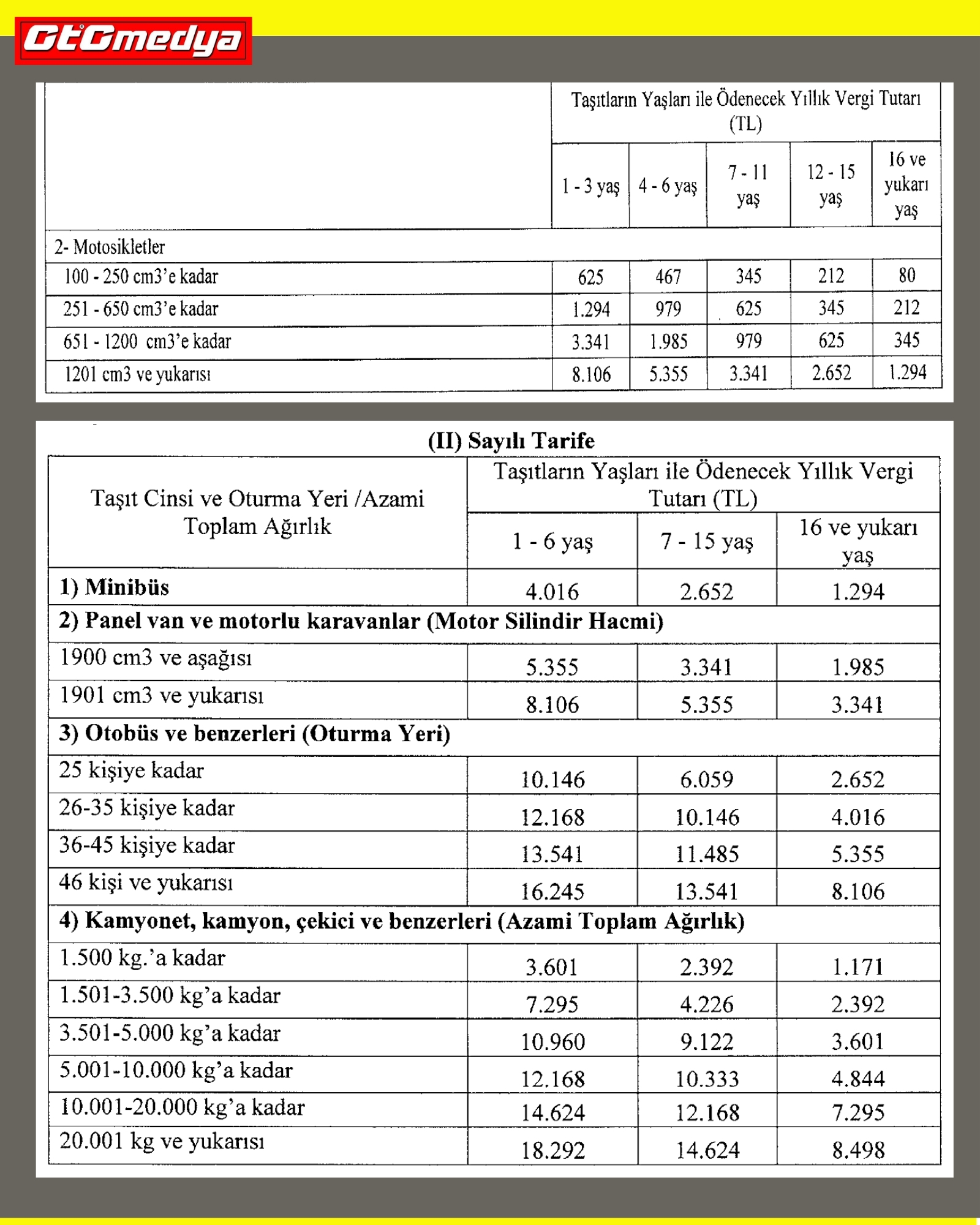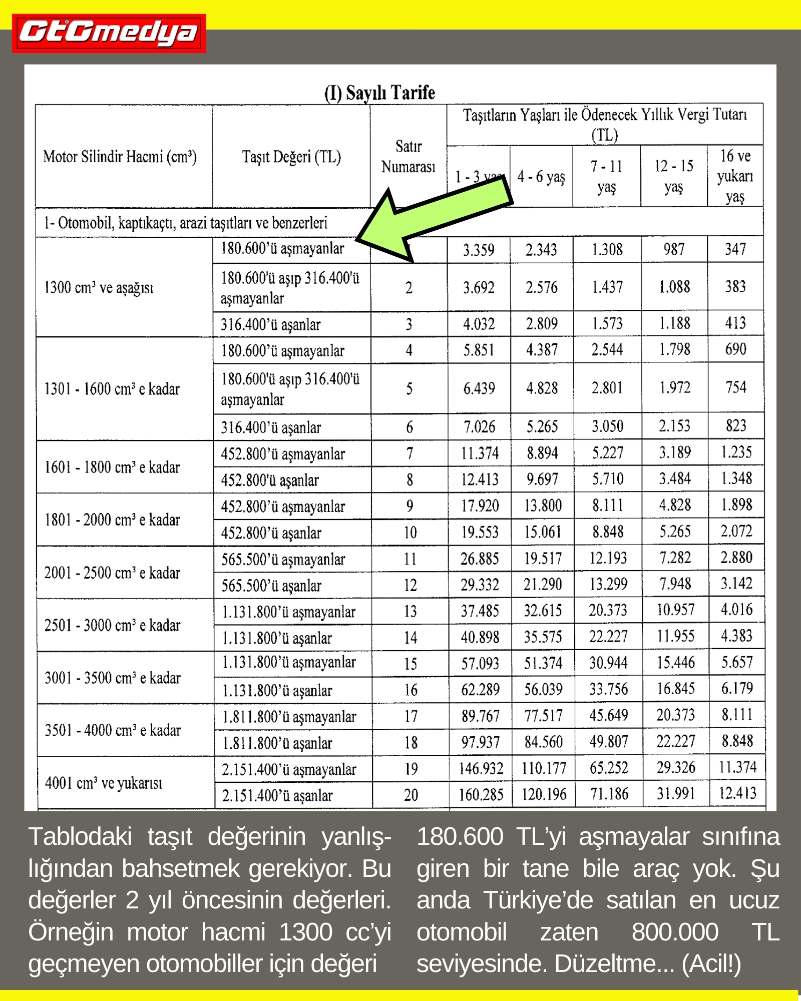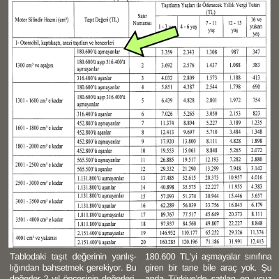 Tablodaki taşıt değerinin yanlış-lığından bahsetmek gerekiyor. Bu değerler 2 yıl öncesinin değerleri. Örneğin motor hacmi 1300 cc’yi geçmeyen otomobiller için değeri 180.600 TL’yi aşmayalar sınıfına giren bir tane bile araç yok. Şu anda Türkiye’de satılan en ucuz otomobil zaten 800.000 TL seviyesinde. Düzeltme... (Lütfen!)