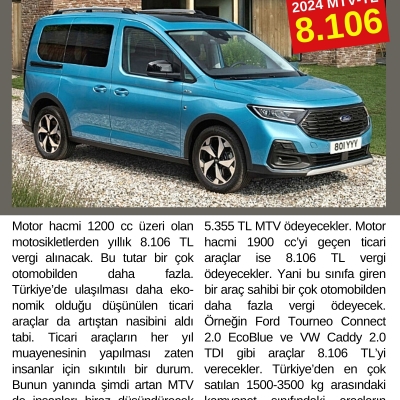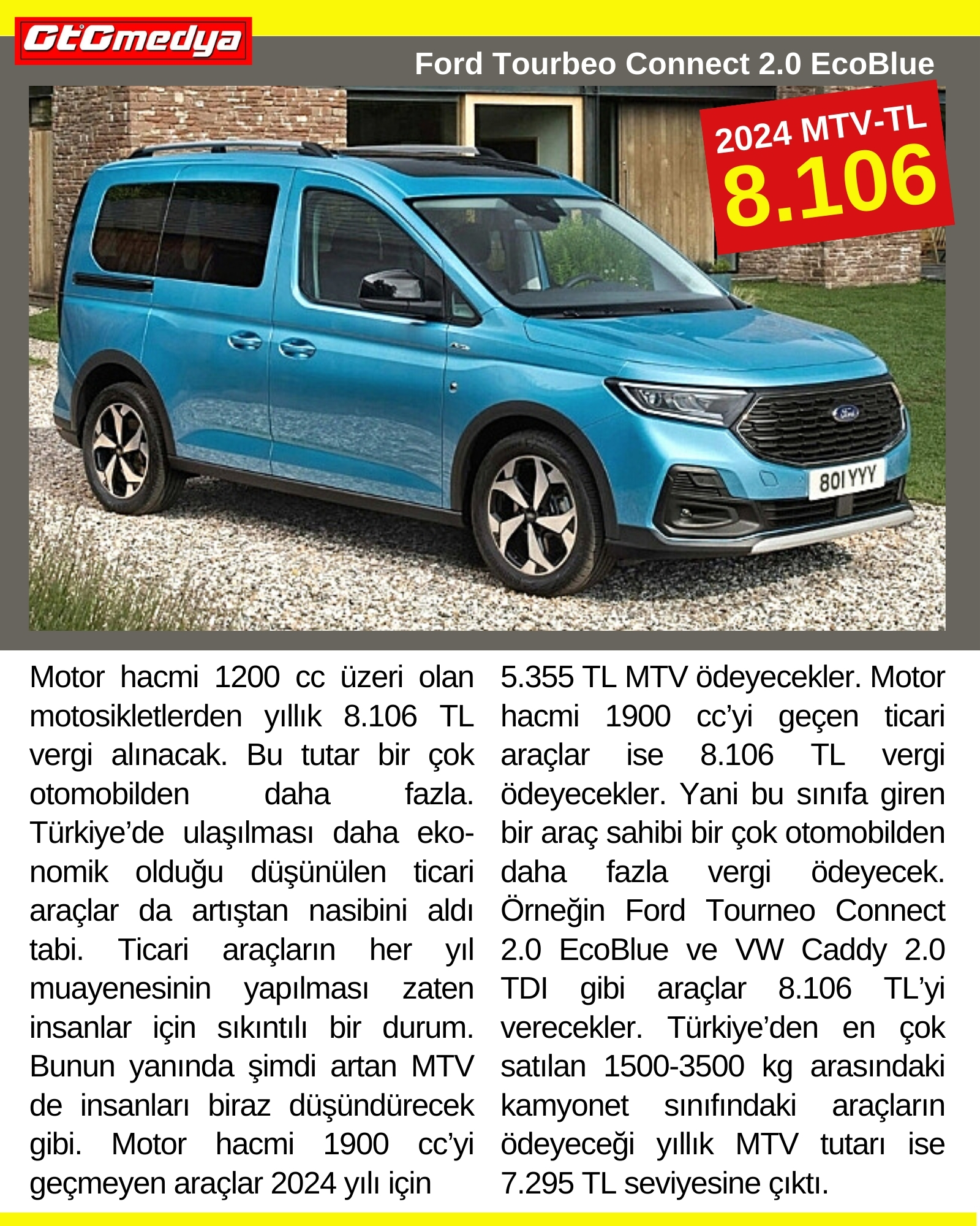 Motor hacmi 1200 cc üzeri olan motosikletlerden yıllık 8.106 TL vergi alınacak. Bu tutar bir çok otomobilden daha fazla. Türkiye’de ulaşılması daha eko-nomik olduğu düşünülen ticari araçlar da artıştan nasibini aldı tabi. Ticari araçların her yıl muayenesinin yapılması zaten insanlar için sıkıntılı bir durum. Bunun yanında şimdi artan MTV de insanları biraz düşündürecek gibi. Motor hacmi 1900 cc’yi geçmeyen araçlar 2024 yılı için 5.355 TL MTV ödeyecekler. Motor hacmi 1900 cc’yi geçen ticari araçlar ise 8.106 TL vergi ödeyecekler. Yani bu sınıfa giren bir araç sahibi bir çok otomobilden daha fazla vergi ödeyecek. Örneğin Ford Tourneo Connect 2.0 EcoBlue ve VW Caddy 2.0 TDI gibi araçlar 8.106 TL’yi verecekler. Türkiye’den en çok satılan 1500-3500 kg arasındaki kamyonet sınıfındaki araçların ödeyeceği yıllık MTV tutarı ise 7.295 TL seviyesine çıktı.