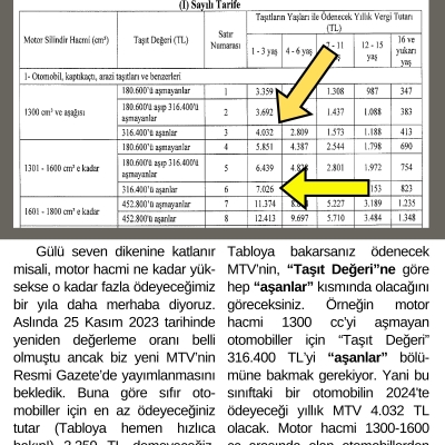 Tabloya bakarsanız ödenecek MTV’nin, “Taşıt Değeri”ne göre hep “aşanlar” kısmında olacağını göreceksiniz. Örneğin motor hacmi 1300 cc’yi aşmayan otomobiller için “Taşıt Değeri” 316.400 TL’yi “aşanlar” bölü-müne bakmak gerekiyor. Yani bu sınıftaki bir otomobilin 2024'te ödeyeceği yıllık MTV 4.032 TL olacak. Motor hacmi 1300-1600 cc arasında olan otomobillerden yıllık alınacak vergi ise 7.026 TL olacak yani.